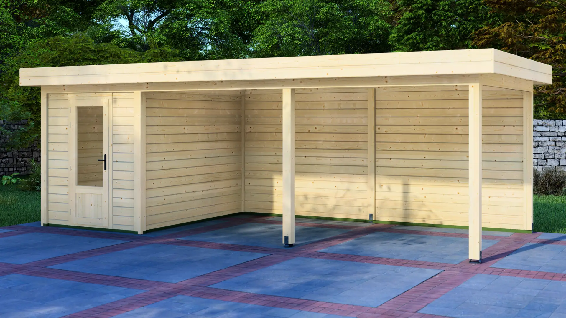 A modular 9m² enclosed Nordic spruce cabin with horizontal cladding and a flat roof that extends to form a 12m² canopy. Calm and minimal in appearance. Fully customizable walls, doors and windows.