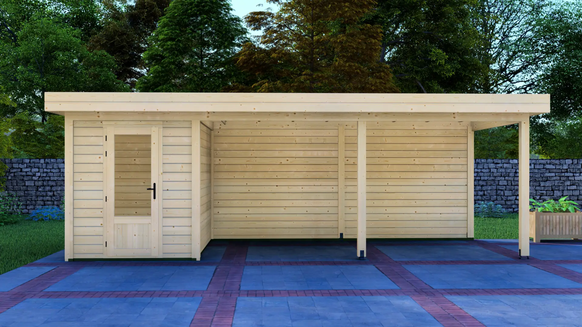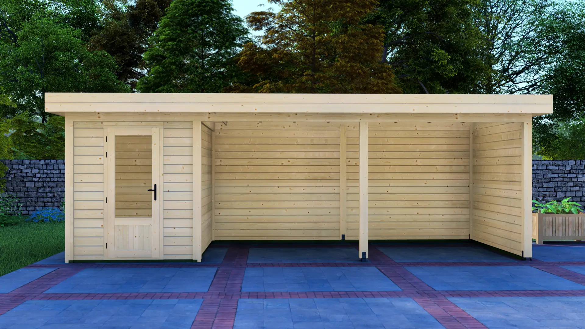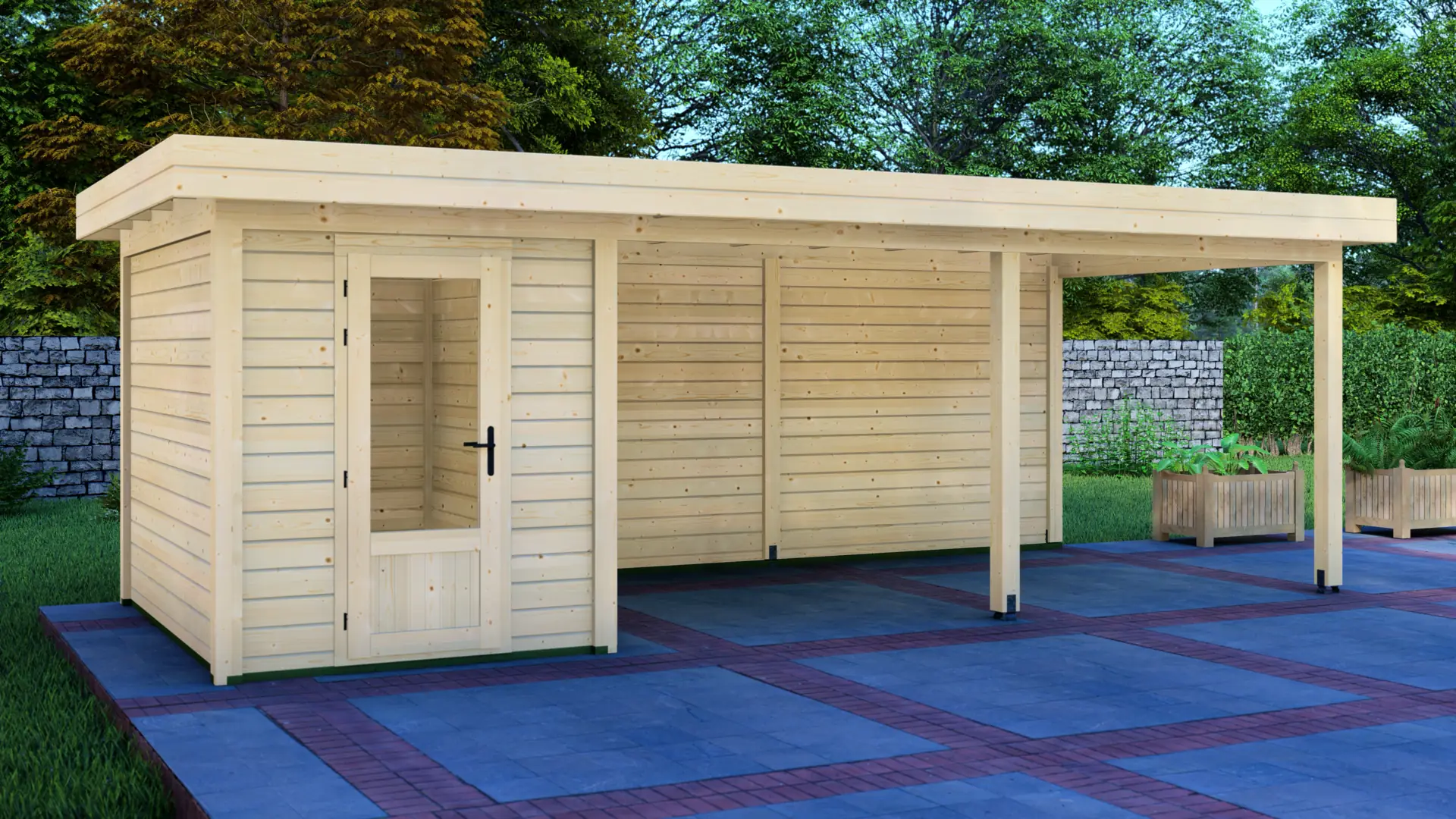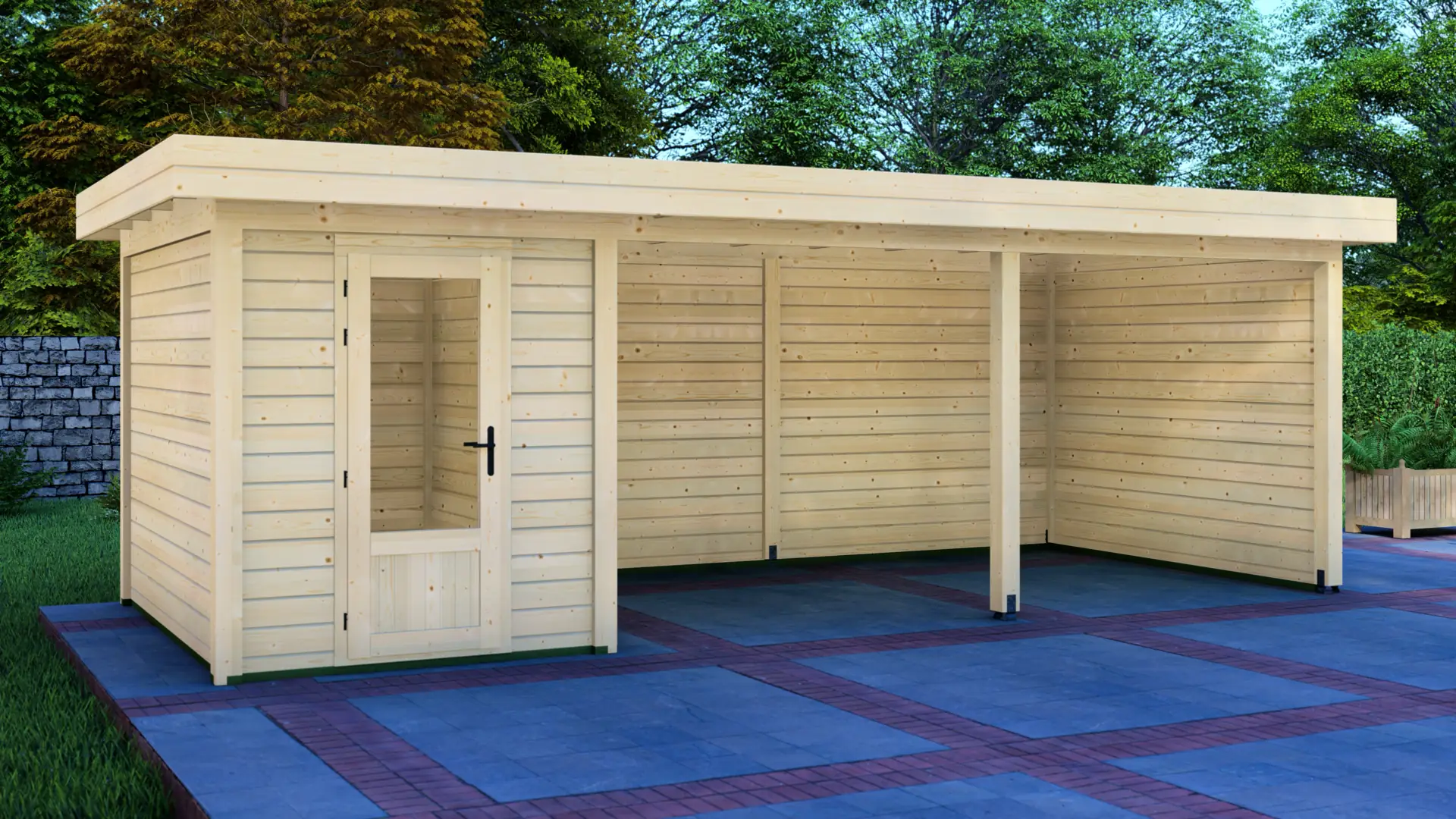 A modular 15m² enclosed Nordic spruce cabin with horizontal cladding and a flat roof. It’s a compact, practical structure that keeps the garden organised and visually tidy.