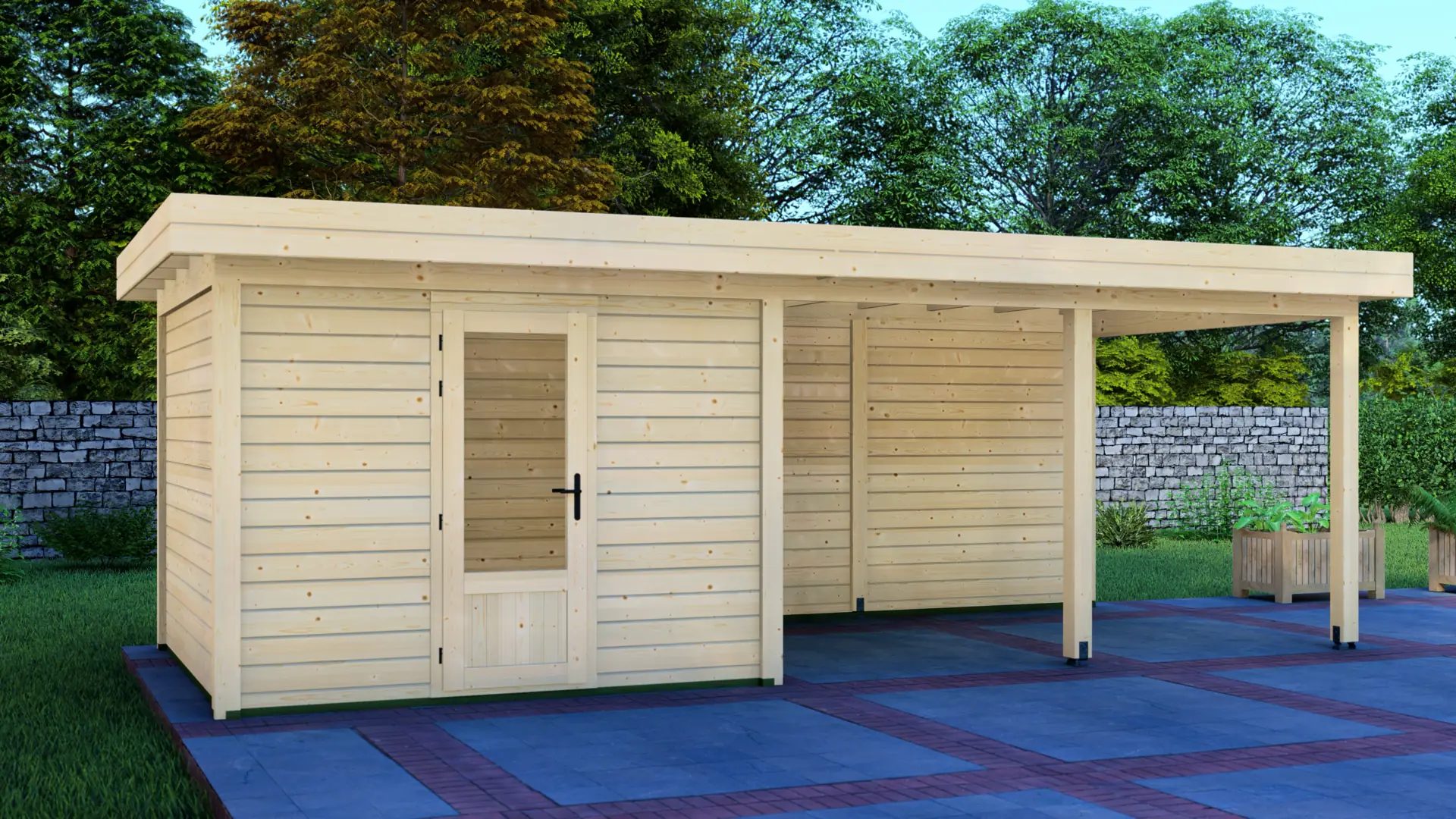 Constructed from slow-grown Nordic spruce, a dense timber that holds up well outdoors. The modern flat roof and vertical load-bearing posts create a rigid, long-lasting frame that stays straight and supports everyday use season after season.