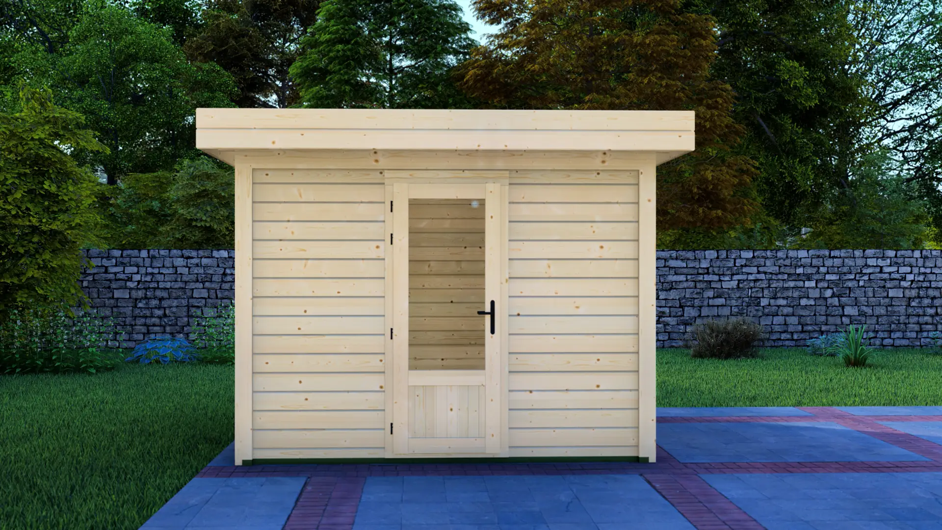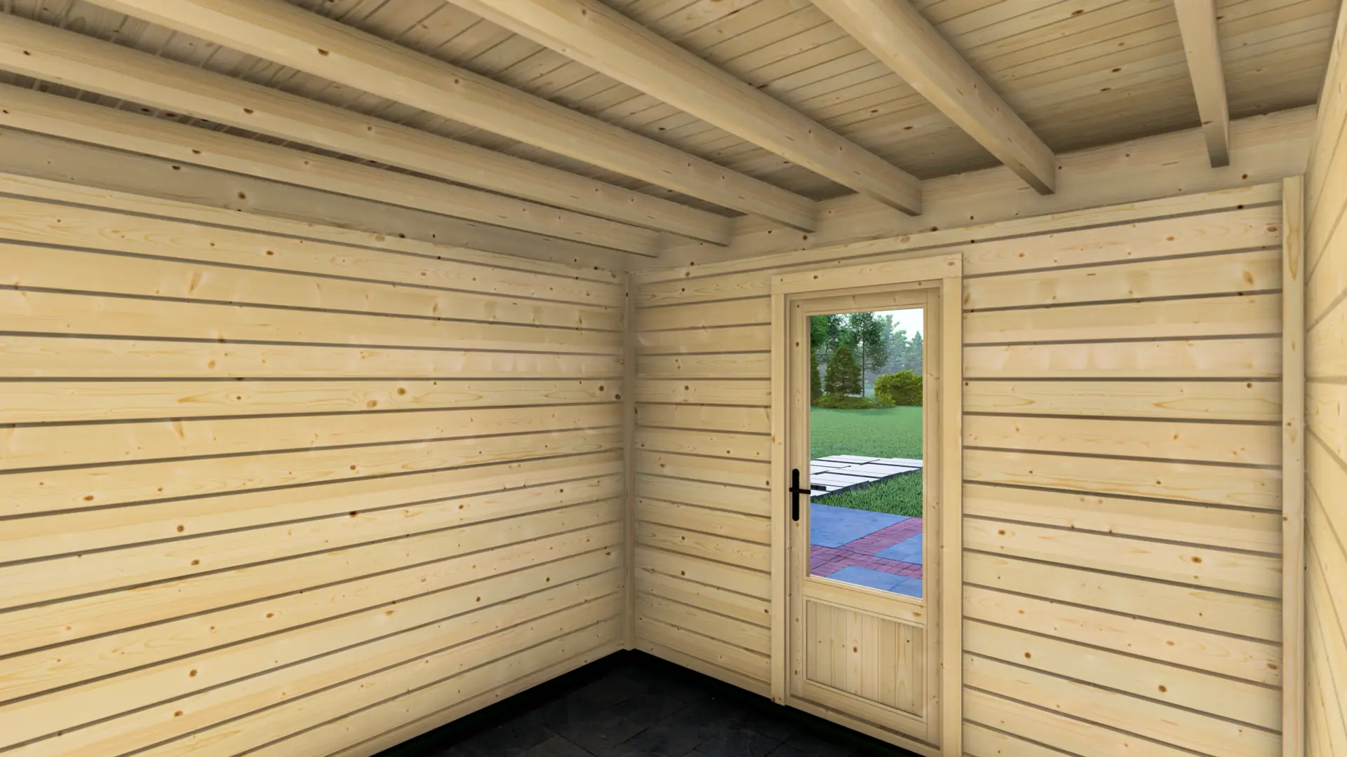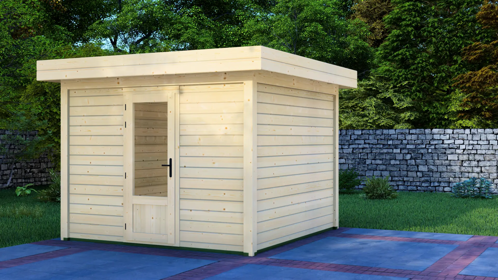 Constructed from slow-grown Nordic spruce, the cabin uses dense timber that performs well outdoors. Vertical load-bearing posts create a rigid structure, while 28mm horizontal cladding boards form a clean, durable exterior. The flat roof profile keeps the overall height practical and helps the cabin sit neatly alongside fences, boundaries, and existing garden structures.