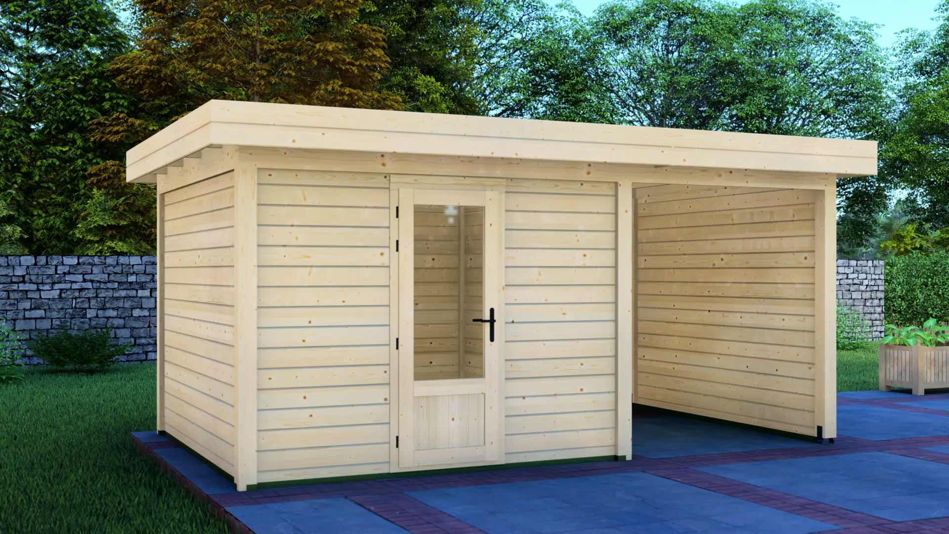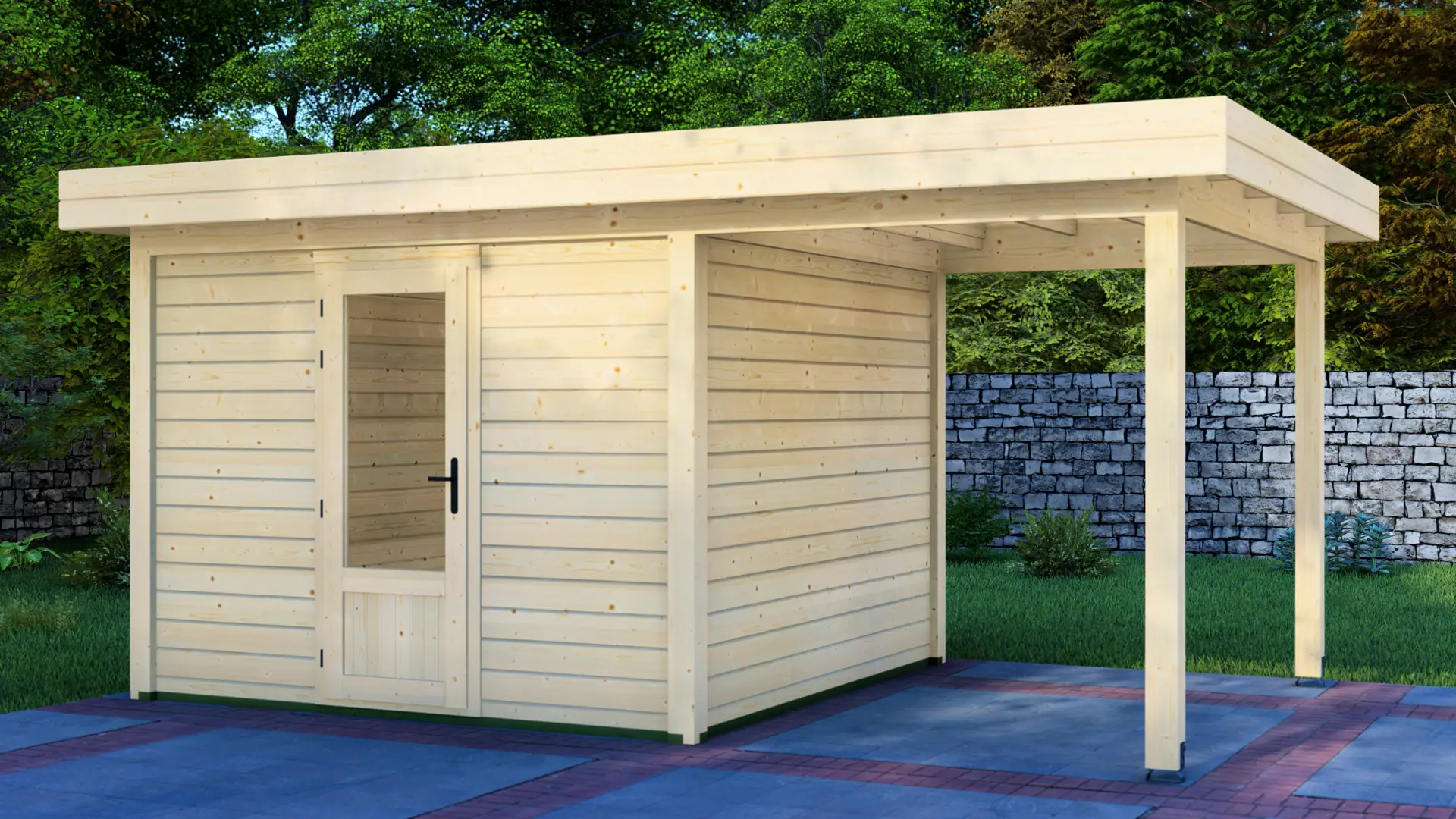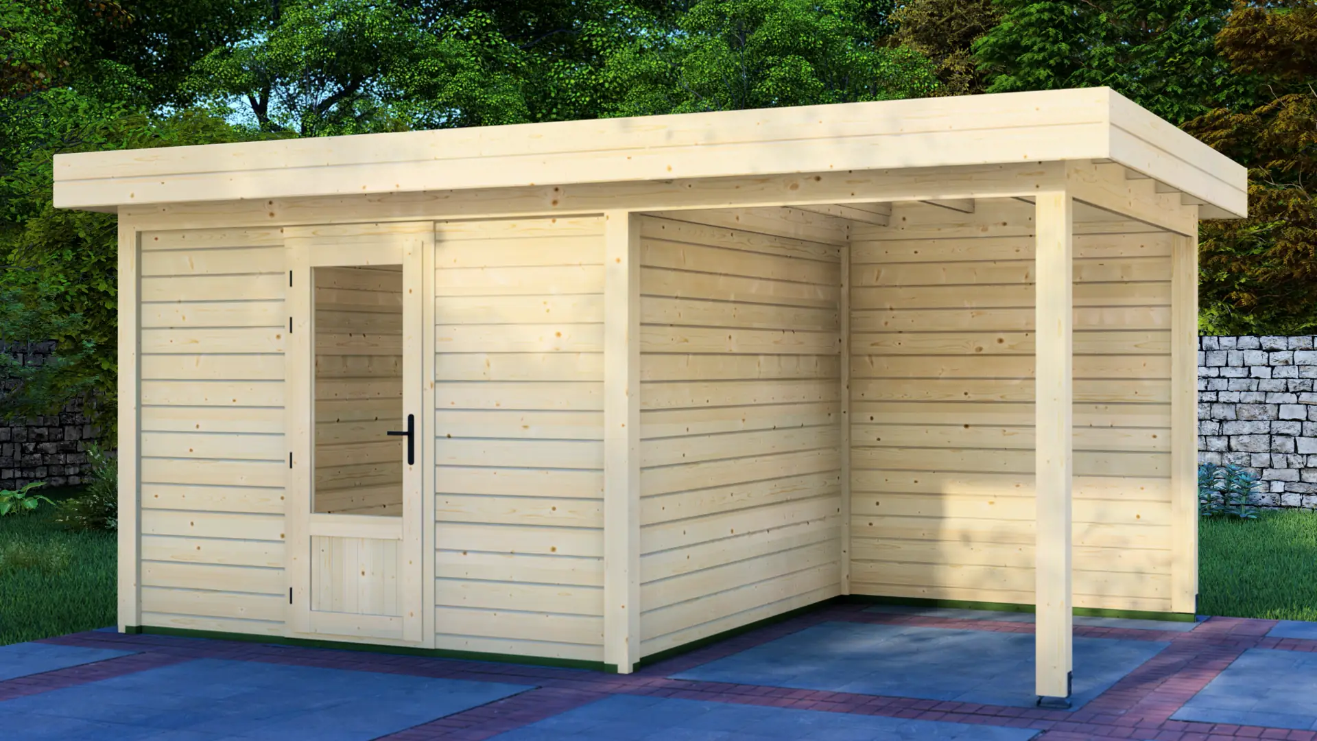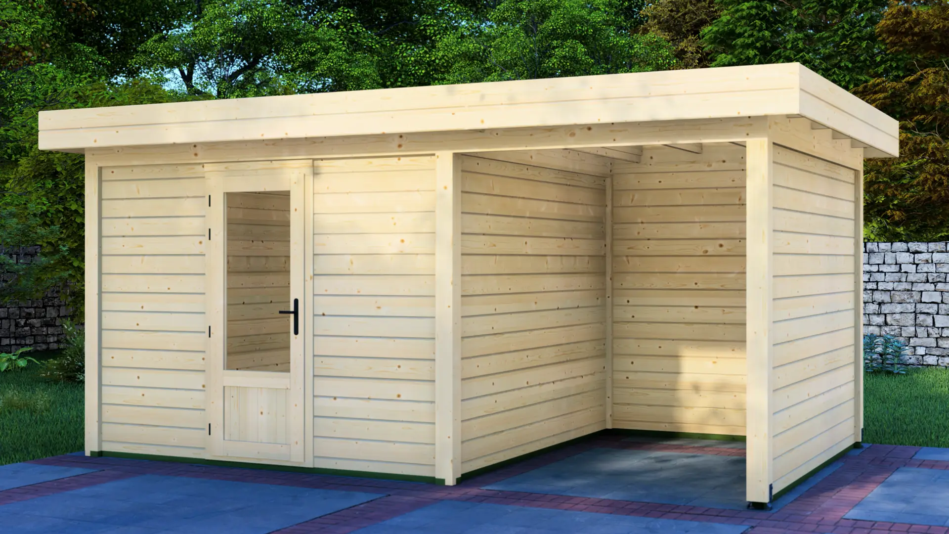 A modular 9m² enclosed Nordic spruce cabin with horizontal cladding and a flat roof that extends to form a 12m² canopy. Calm and minimal in appearance. Fully customizable walls, doors and windows.