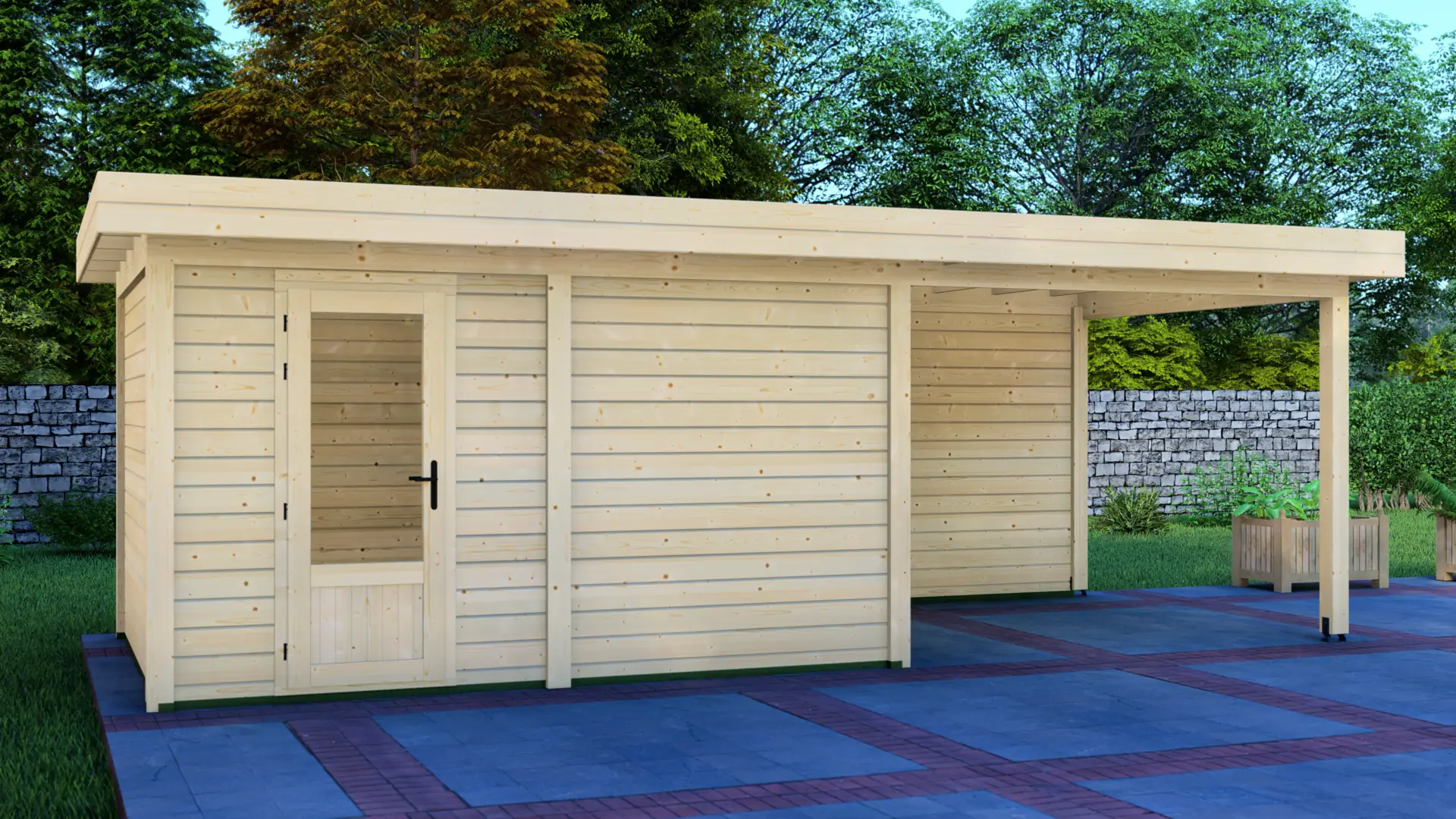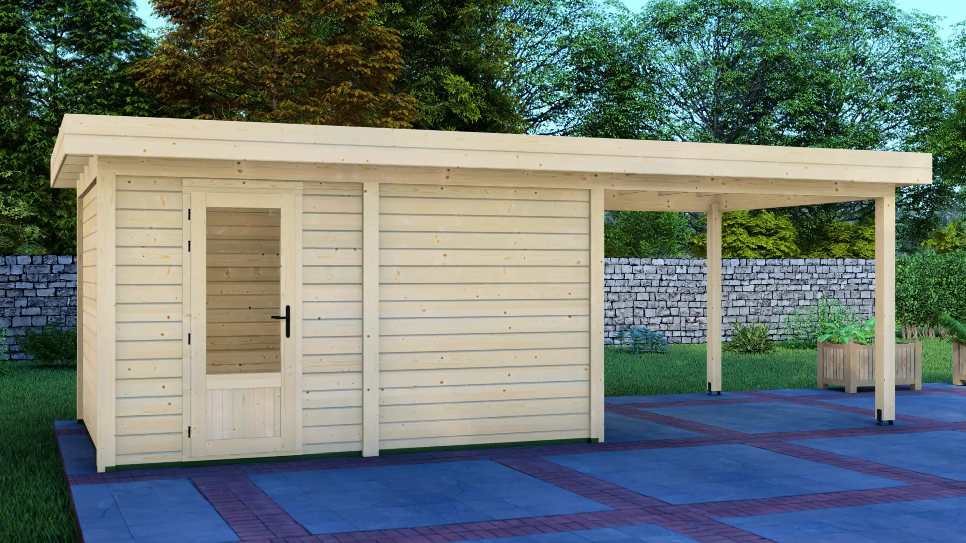 Constructed from slow-grown Nordic spruce, a dense timber that holds up well outdoors. The modern flat roof and vertical load-bearing posts create a rigid, long-lasting frame that stays straight and supports everyday use season after season.