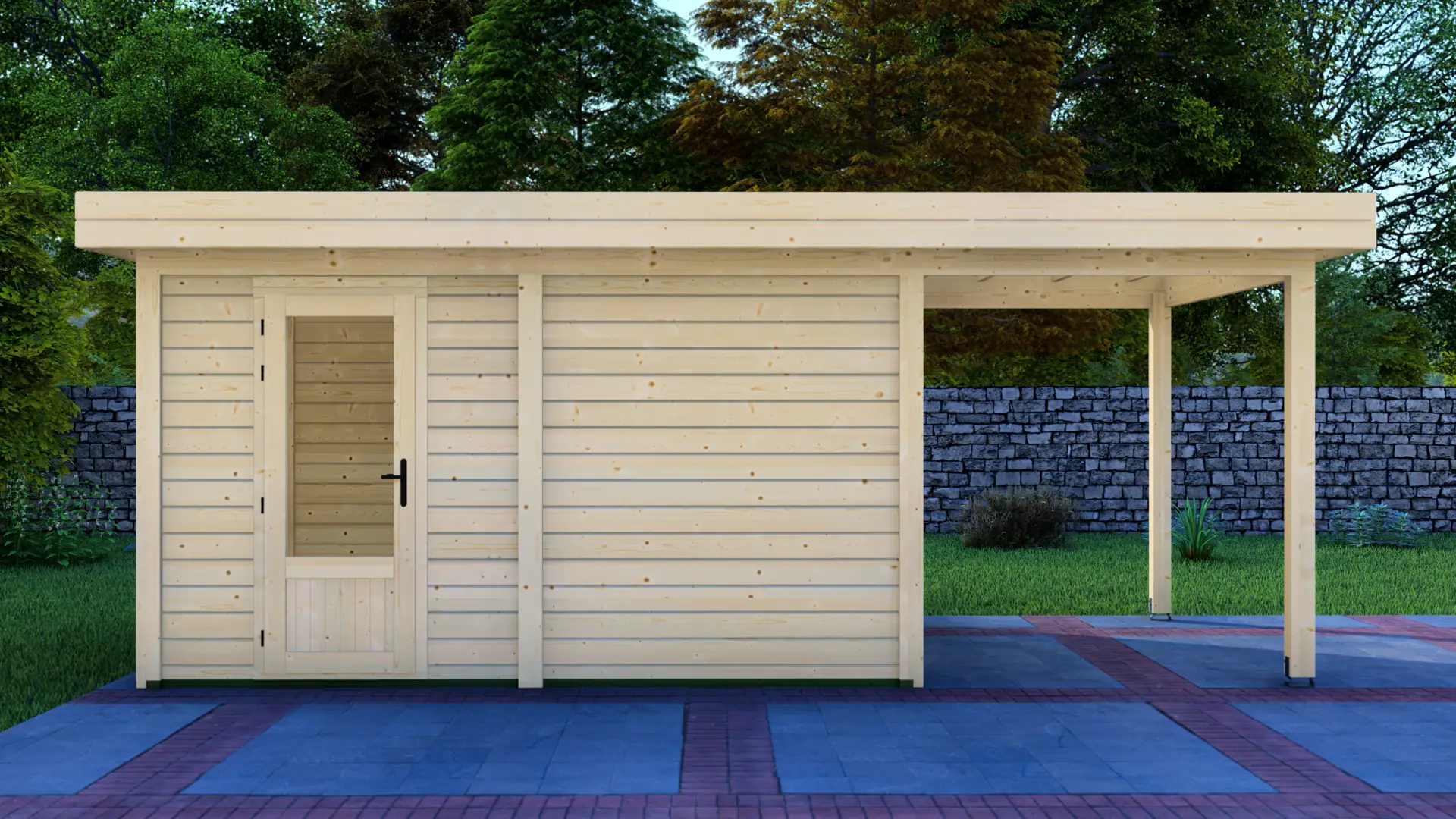 A modular 15m² enclosed Nordic spruce cabin with horizontal cladding and a flat roof that extends to form a 9m² canopy. Calm and minimal in appearance. Fully customizable walls, doors and windows.