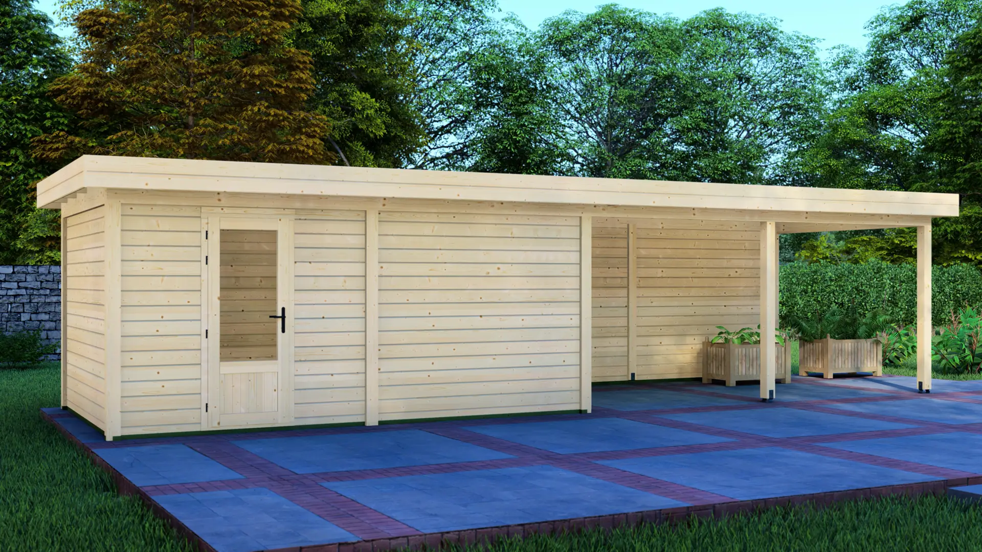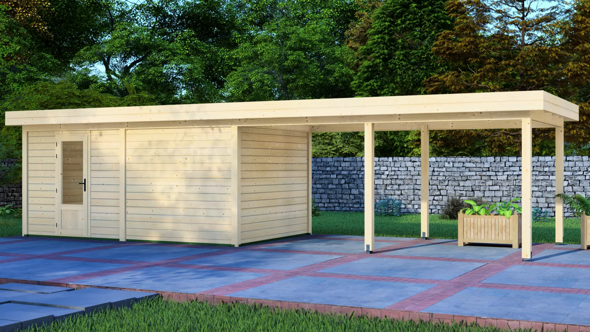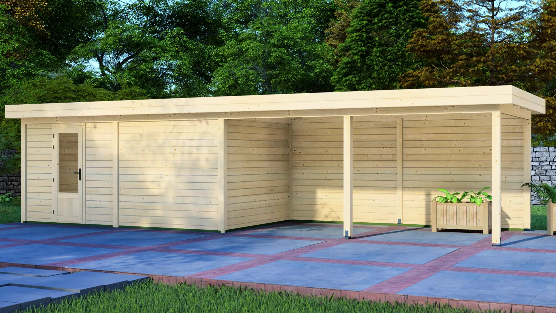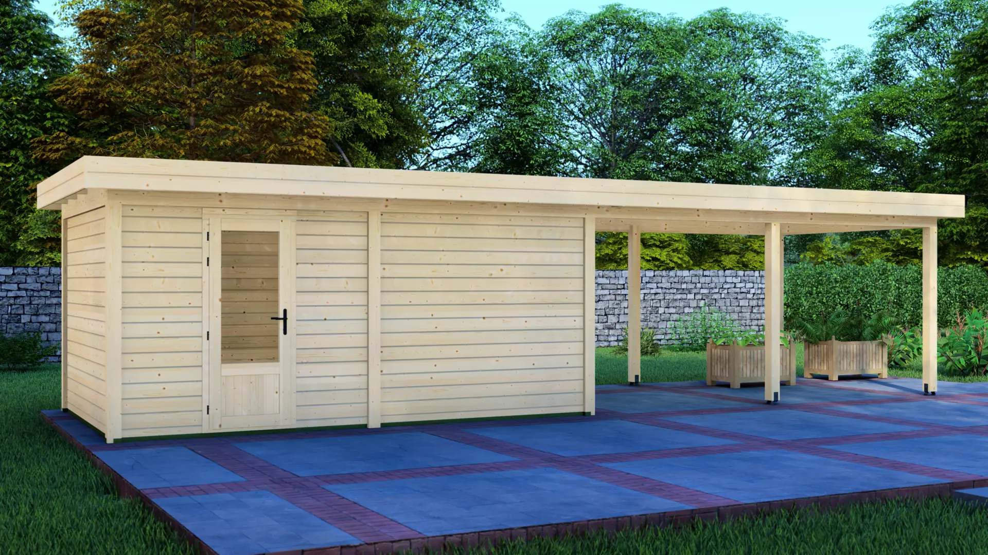 Constructed from slow-grown Nordic spruce, a dense timber that holds up well outdoors. The modern flat roof and vertical load-bearing posts create a rigid, long-lasting frame that stays straight and supports everyday use season after season.