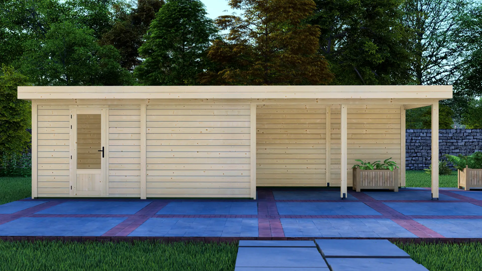A modular 12m² enclosed Nordic spruce cabin with horizontal cladding and a flat roof that extends to form a 12m² canopy. Calm and minimal in appearance. Fully customizable walls, doors and windows.