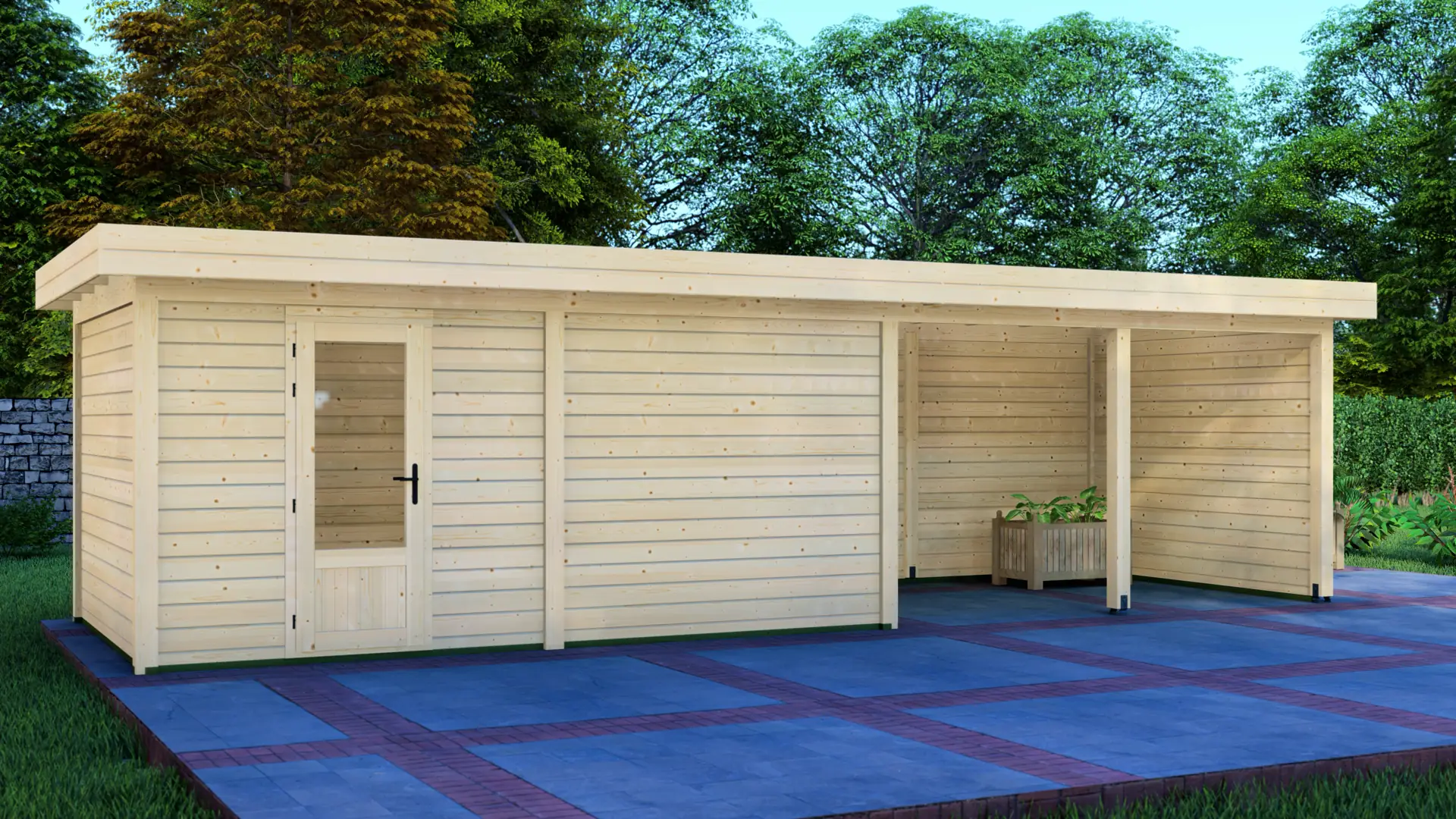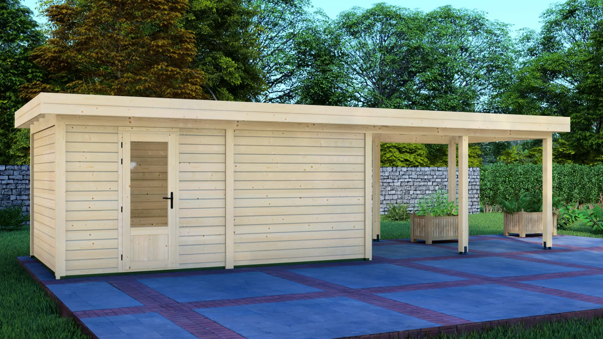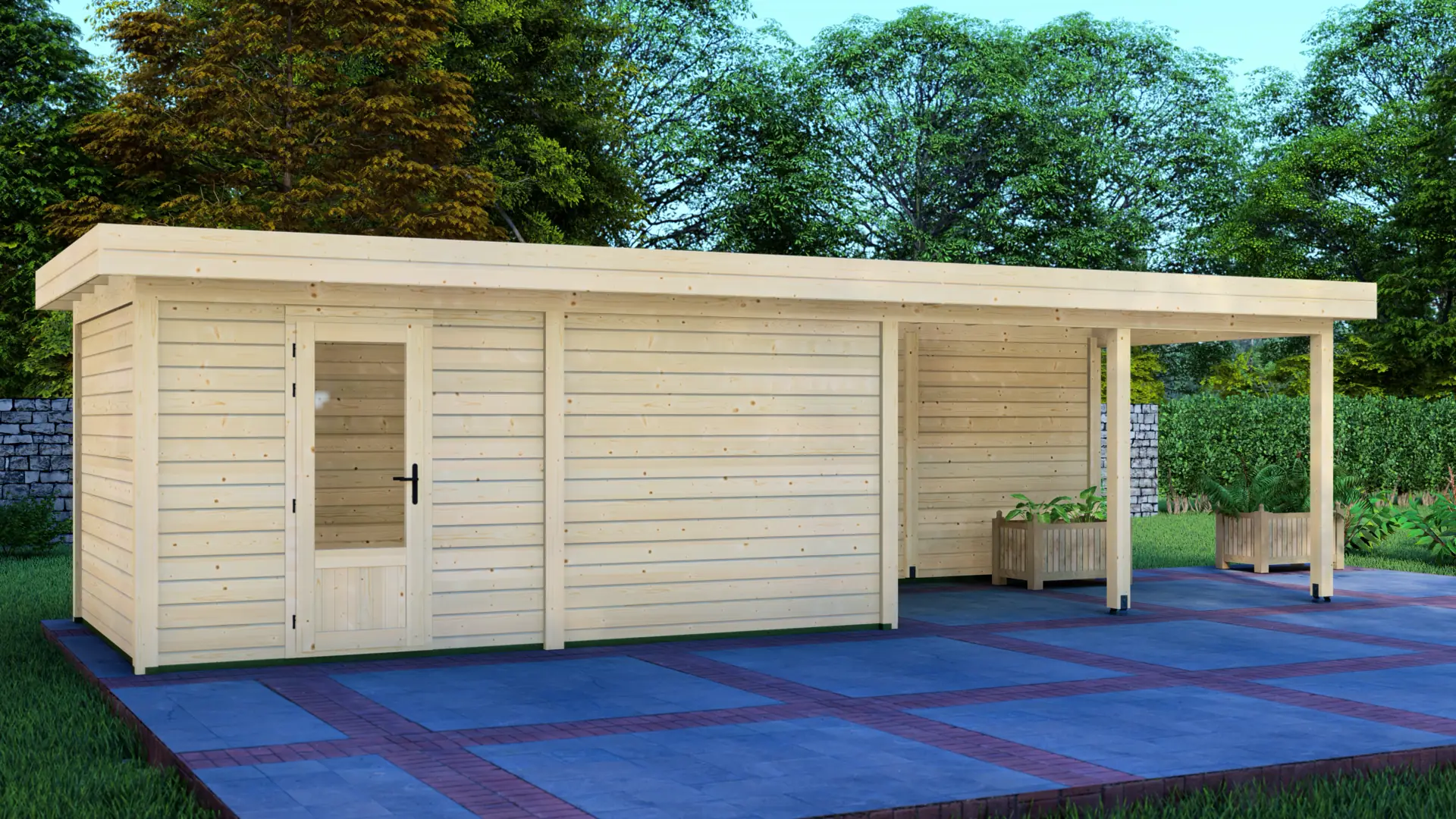 A modular 15m² enclosed Nordic spruce cabin with horizontal cladding and a flat roof. It’s a compact, practical structure that keeps the garden organised and visually tidy.