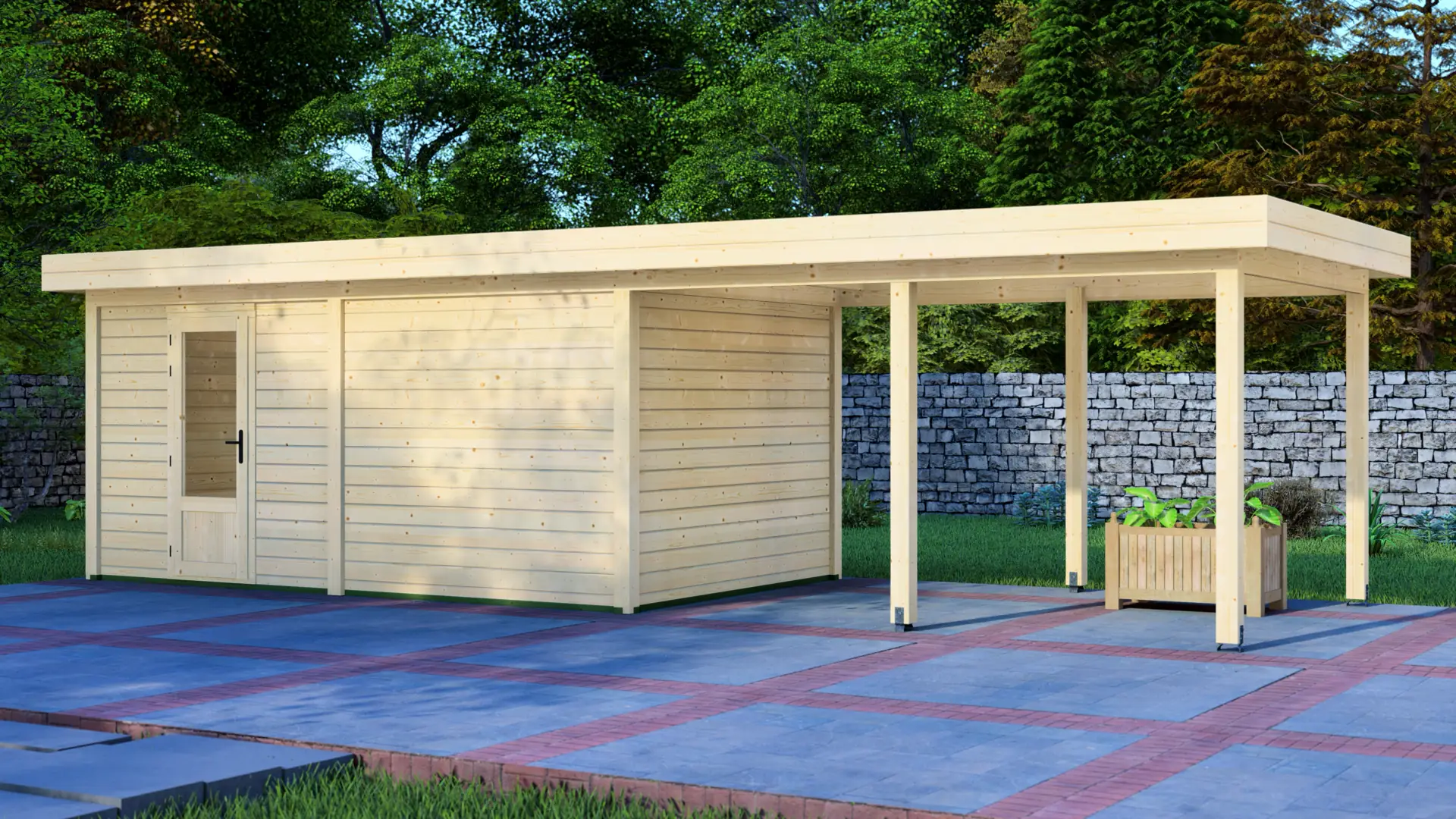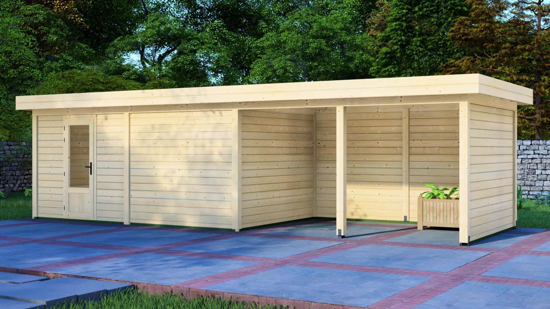 A modular 15m² enclosed Nordic spruce cabin with horizontal cladding and a flat roof that extends to form a 12m² canopy. Calm and minimal in appearance. Fully customizable walls, doors and windows.