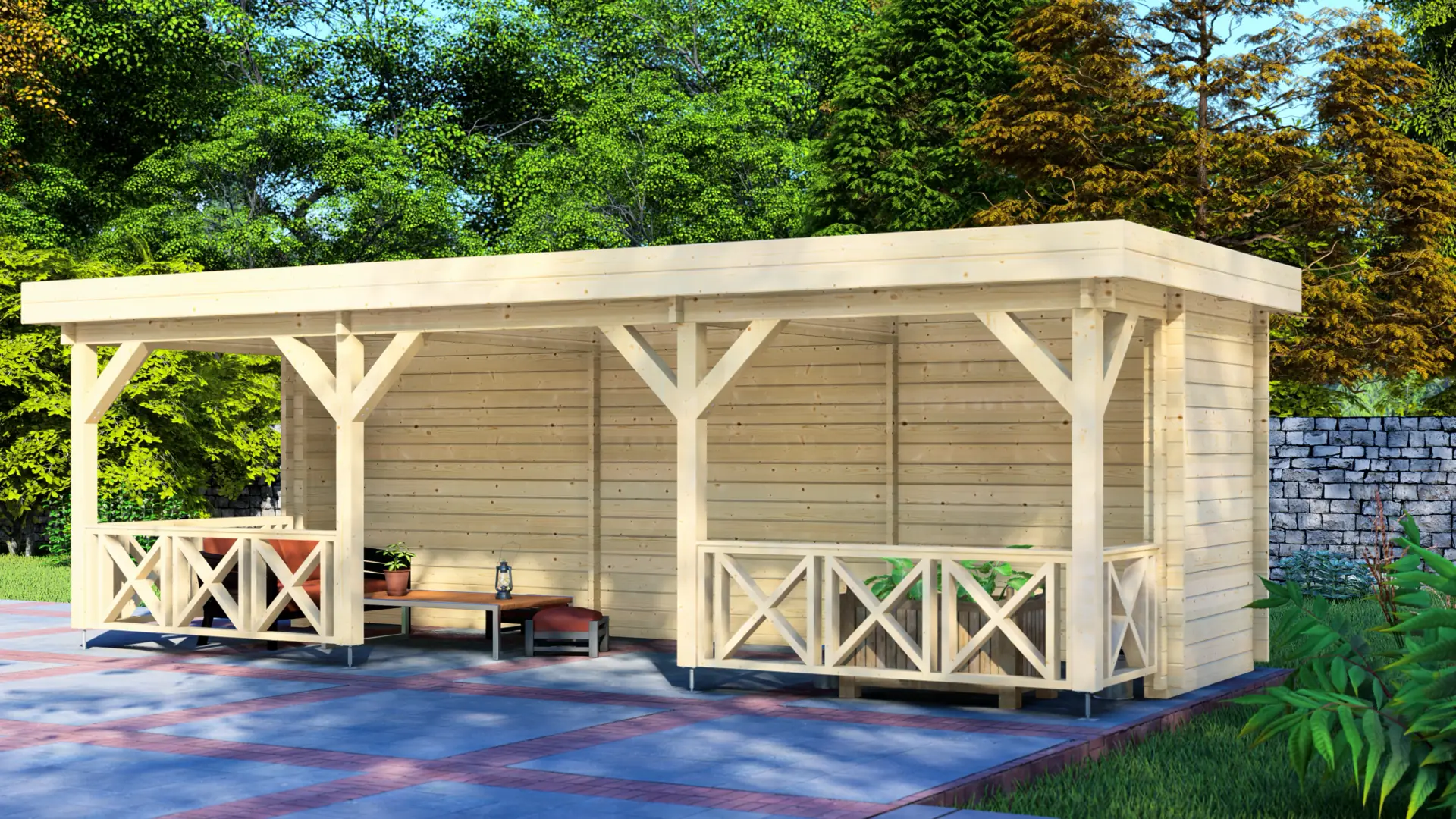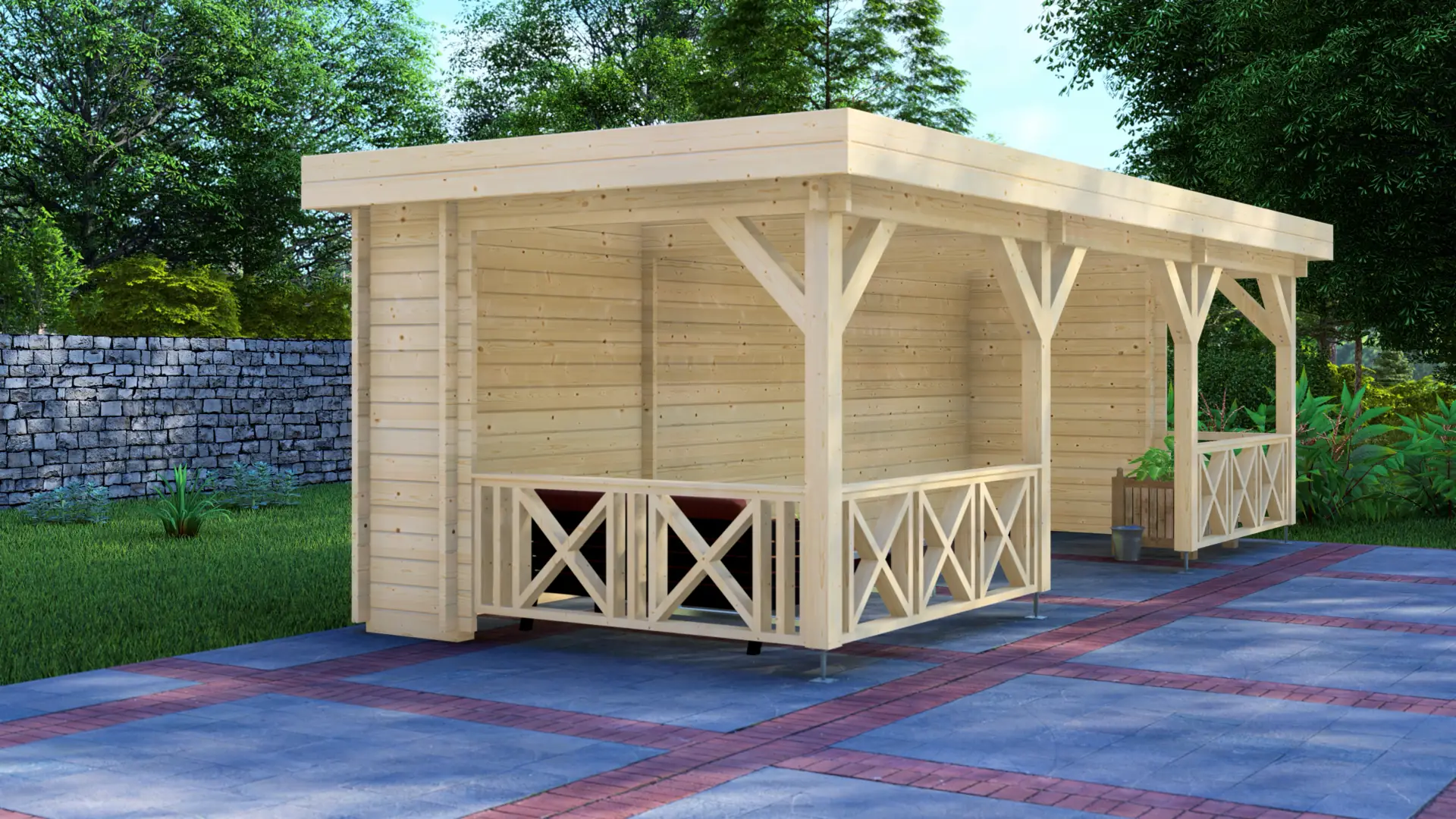 A crisp, architectural timber cabin with an extended canopy that creates a more spacious sheltered area. The enclosed 6 m² section is intended for secure storage, keeping everyday garden items organised and out of sight. The 12 m² covered veranda suits lounging in shade, a jacuzzi cover, or a simple pool-house style shelter for towels and equipment. Total footprint is 18 m². Precision-cut spruce with 18 mm vertical Nordic spruce cladding.