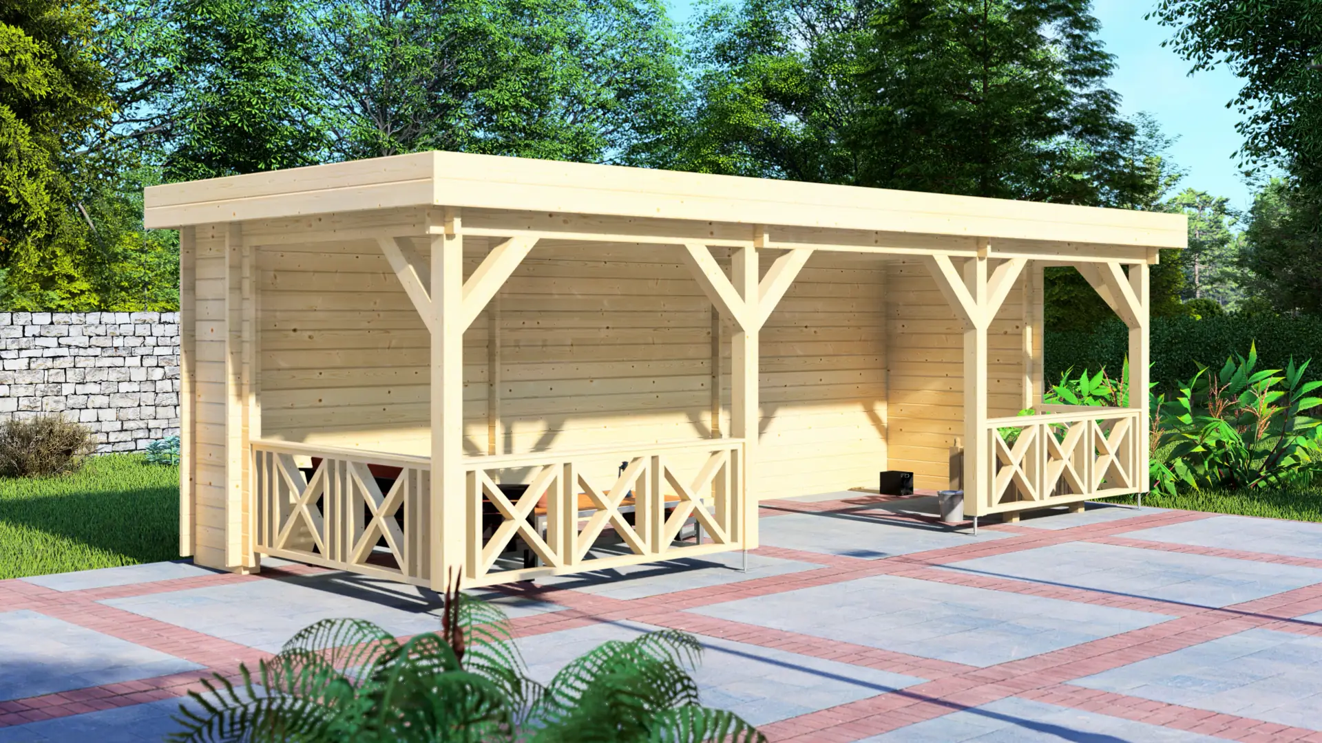 The Canopy Open delivers 22.5m² of fully covered open-air space in an elongated 3×7.5m footprint. This 44mm Nordic spruce structure features three open bays with decorative railings backed by a solid spruce wall. The pent roof and open design suit clients seeking weather-protected outdoor entertaining, gardening workspace, or display areas without enclosed walls.