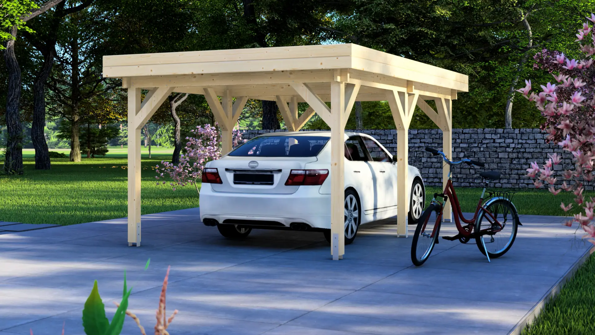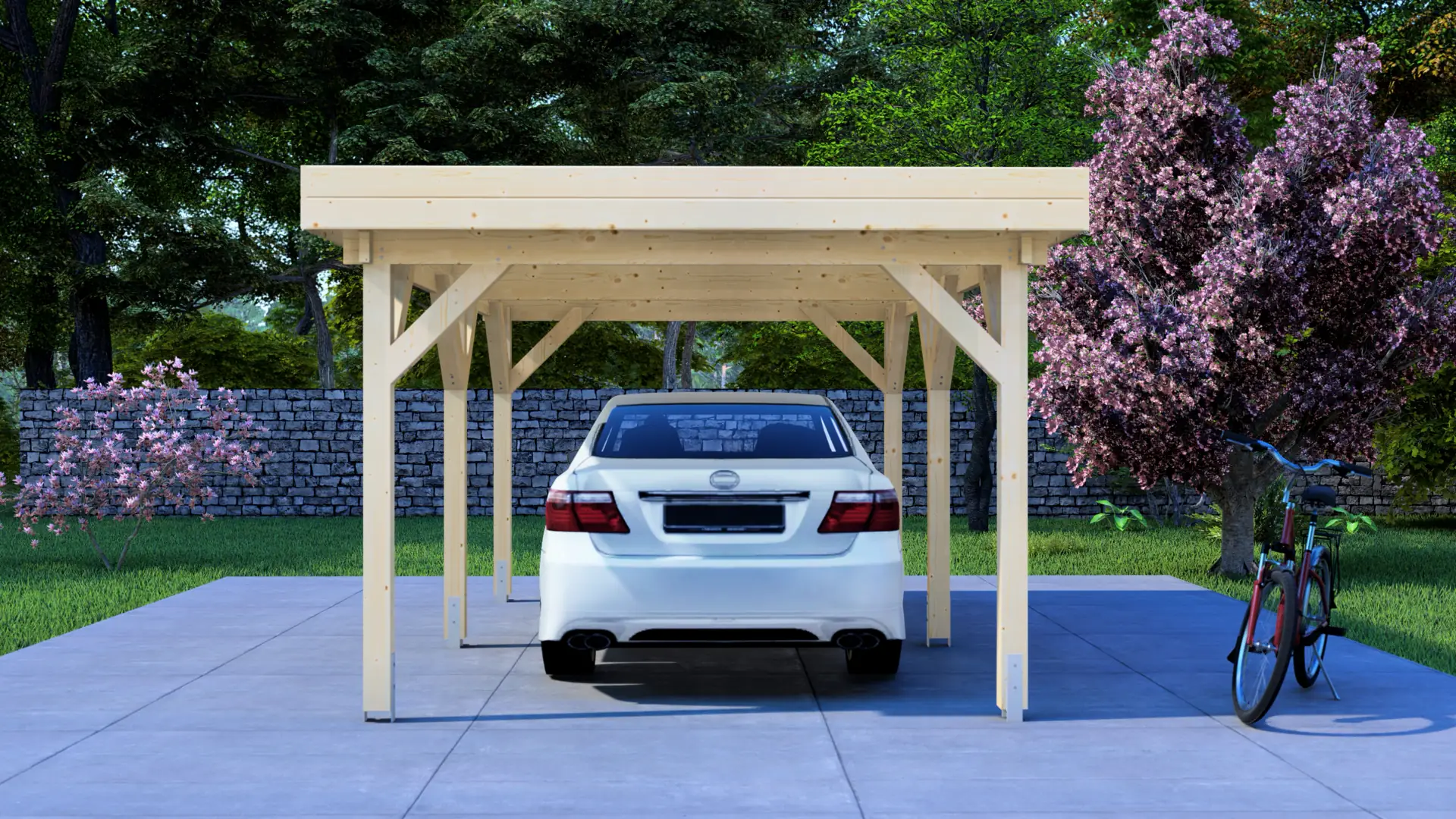 The Carport Classic 7×4 Flat offers substantial shelter for vehicles, equipment, and outdoor spaces. Constructed from premium Nordic spruce, it provides natural weather resistance and durability. This flexible structure serves as vehicle protection, covered workspace, outdoor seating area, storage solution, or entertainment space.