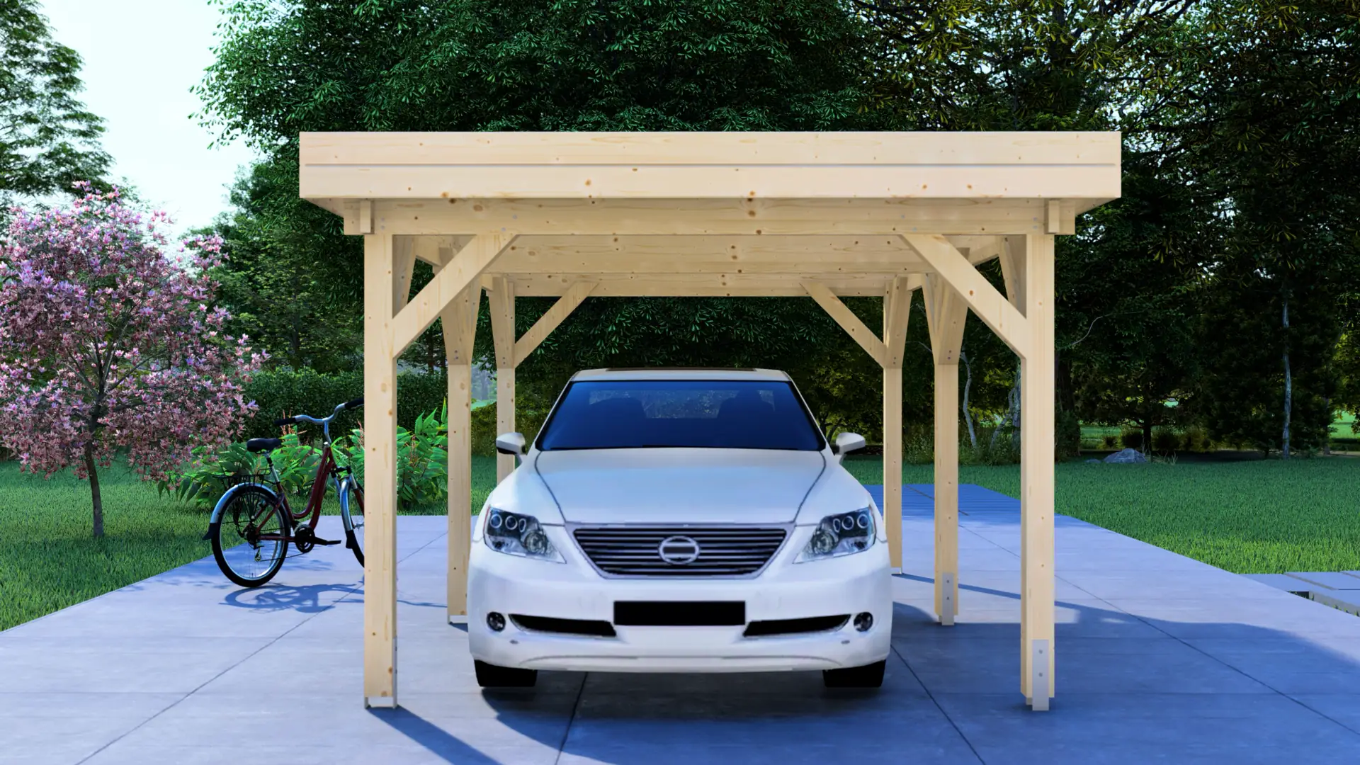 The entire carport is made from Nordic spruce wood with 44mm thick profiles. This wood type is valued for its tight grain pattern, stability, and natural ability to resist moisture. All components are cut to exact measurements using computerised machinery, which means every piece fits together perfectly without any guesswork during assembly.
