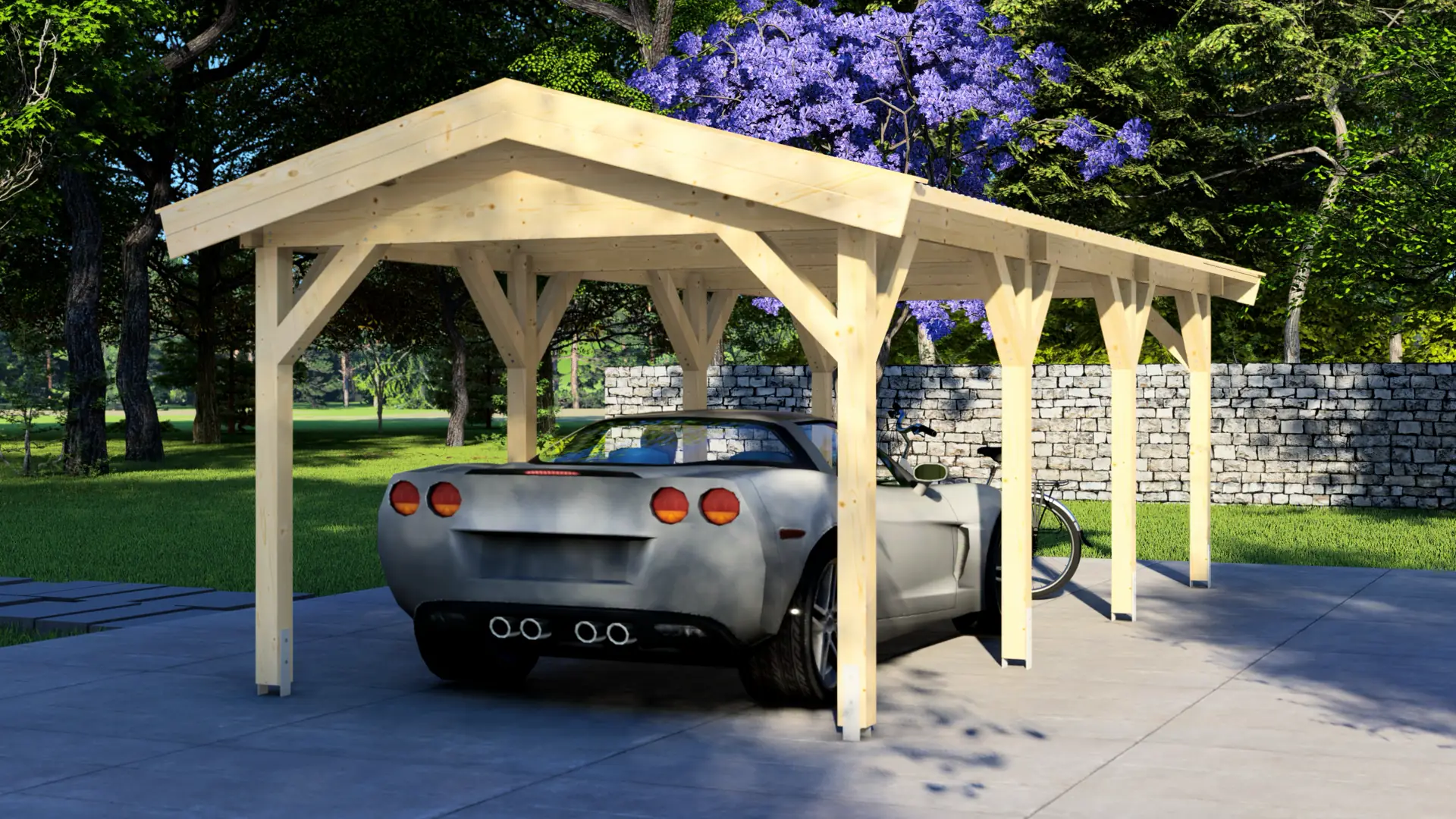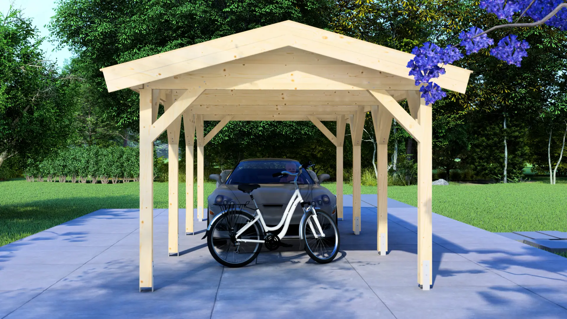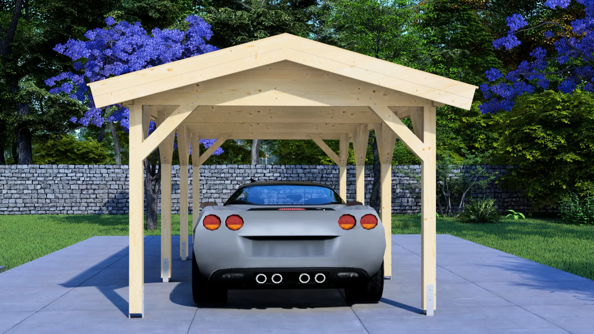 The entire carport uses Nordic spruce wood with 44mm thick profiles. This wood type is valued for its tight grain pattern, stability, and natural ability to resist moisture. All components are cut to exact measurements using computerised machinery, meaning every piece fits together perfectly without any guesswork during assembly.