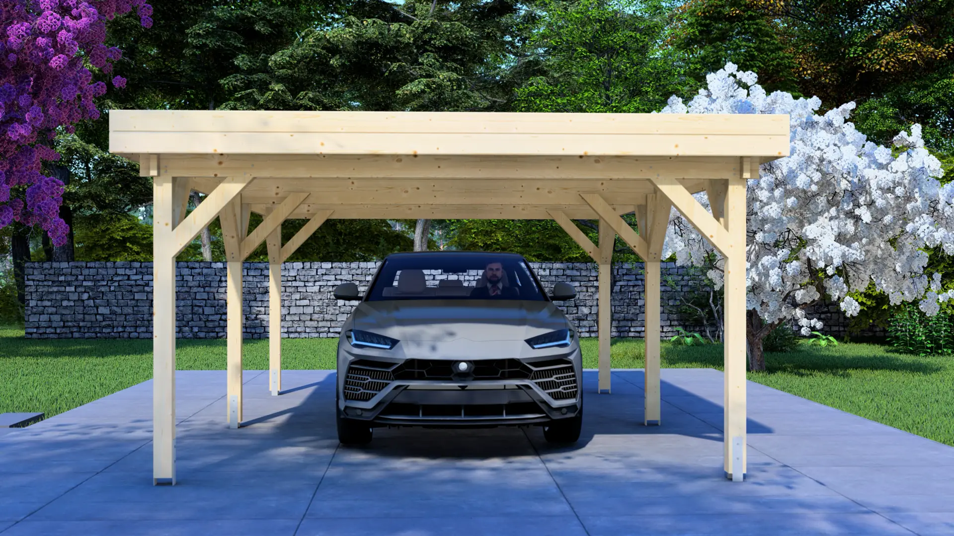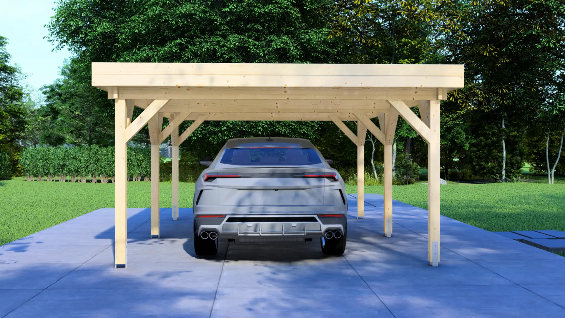 Measuring 5.95 metres in length and 4.18 metres in width, this mid-sized carport stands on six robust wooden posts (120mm square), offering ample space for one standard car or several motorcycles and bicycles. The solid timber frame ensures long-lasting stability and structural integrity. Wooden brackets at each post provide additional strength and visual appeal.