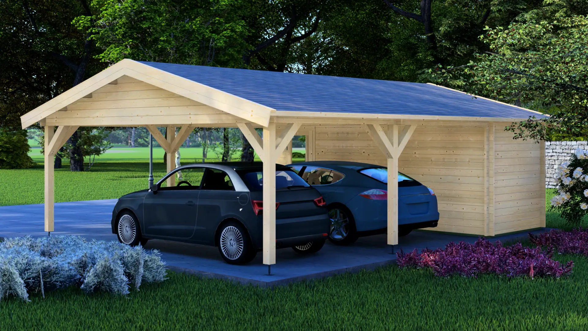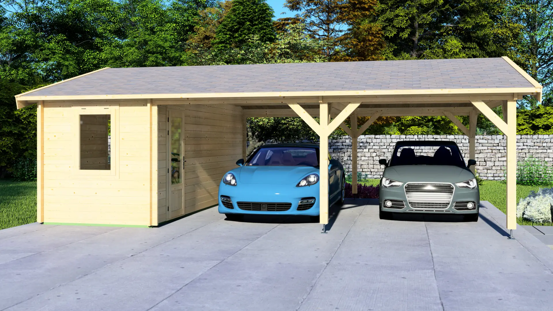 The Carport Double is a high-performance timber structure designed to provide comprehensive weather protection for two vehicles while offering an integrated enclosed storage room. Built from slow-grown Nordic spruce with 44mm wall profiles, this open-concept shelter combines the natural aesthetics of wood with heavy-duty structural engineering.