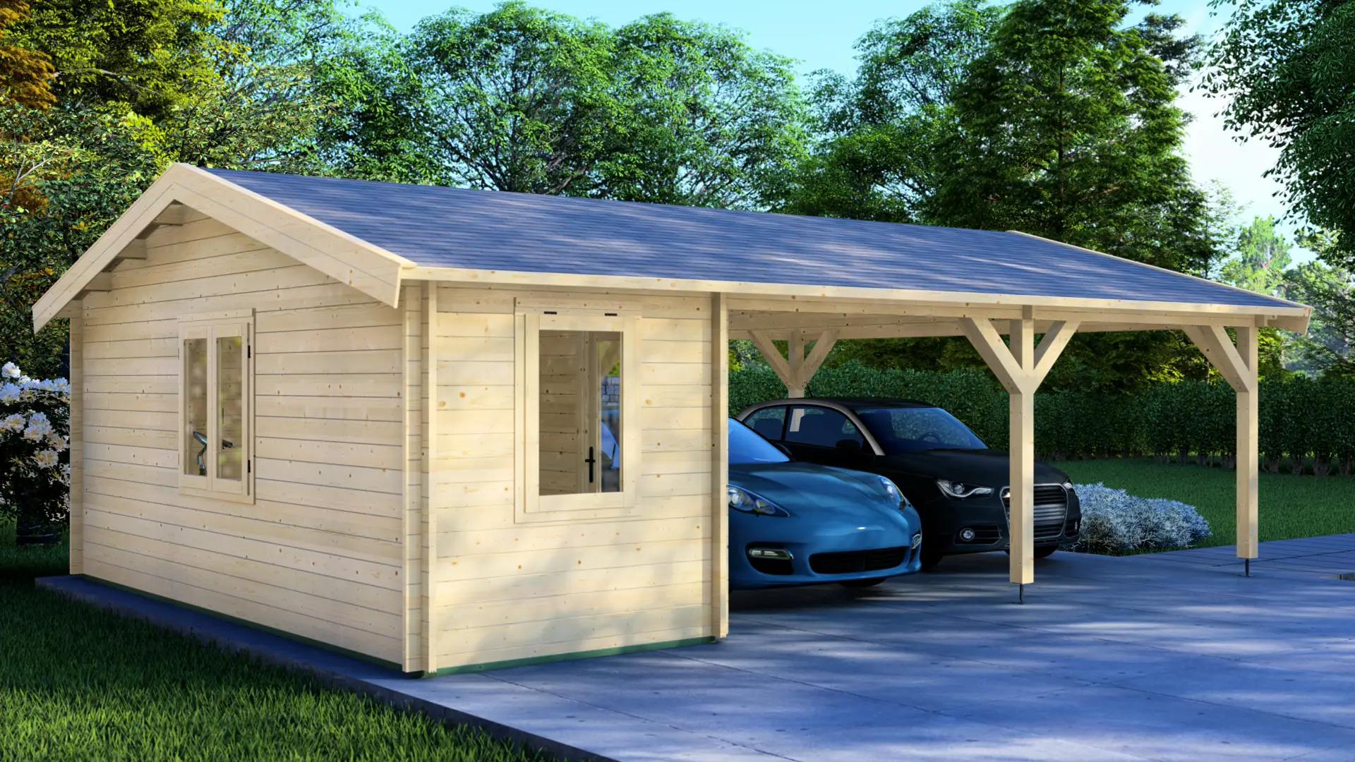 Crafted from 44mm Nordic spruce with pre-cut, labelled components for straightforward assembly. Overall size is 5.95m × 8.00m. The enclosed storage room is about 13m² for bikes, garden equipment, or a small workbench. The open carport area is about 33m² and comfortably fits 2 cars side-by-side. Traditional apex roof design.