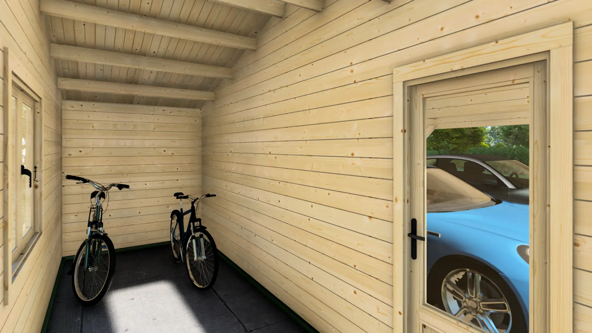 The structure includes a dedicated enclosed room with 44mm walls, perfect for secure storage of automotive tools, bicycles, or garden machinery away from the elements.