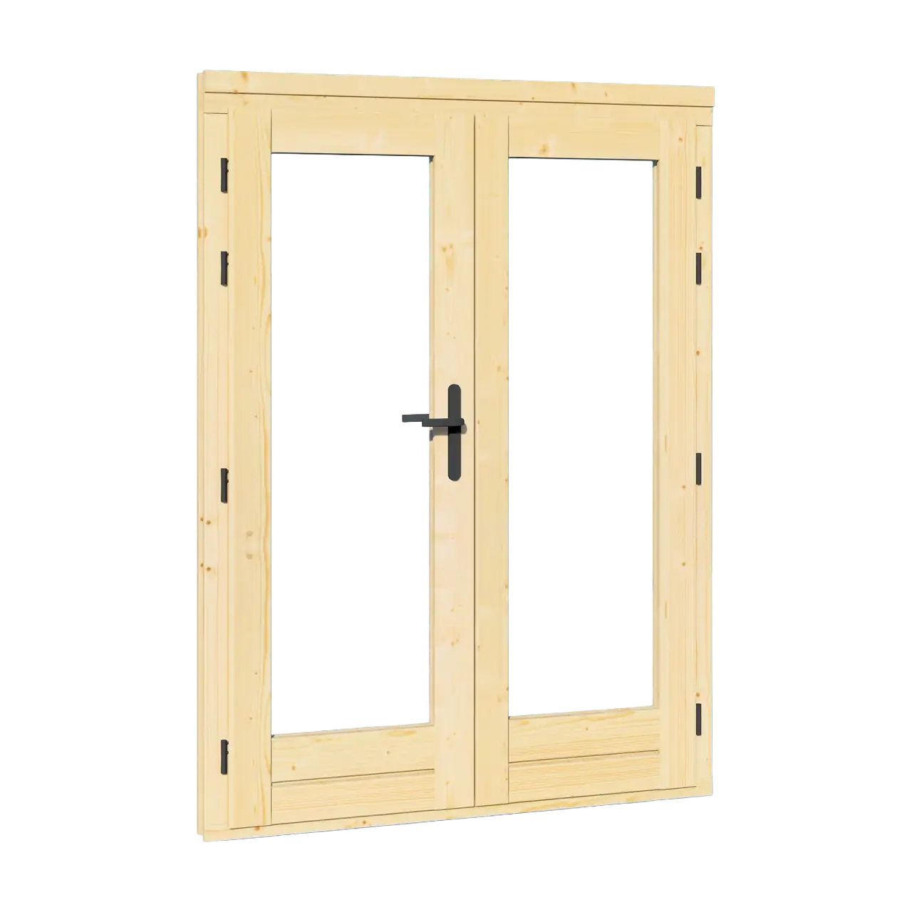 The SDD-3 Low is a premium outward-opening timber double door for garden buildings, log cabins, garages, and summerhouses. Built from a 45mm solid spruce profile, it delivers a traditional timber look with reliable structural strength.