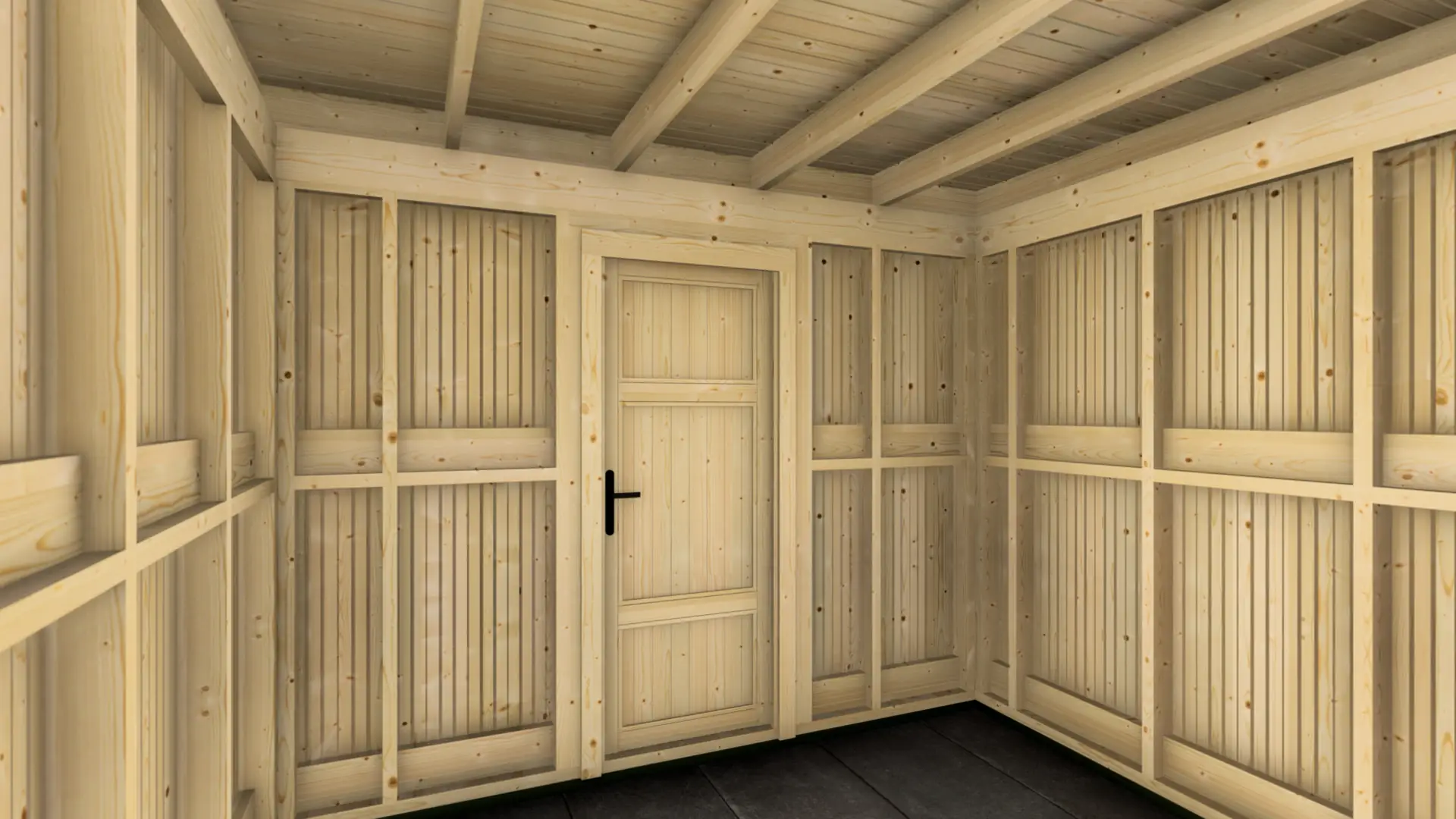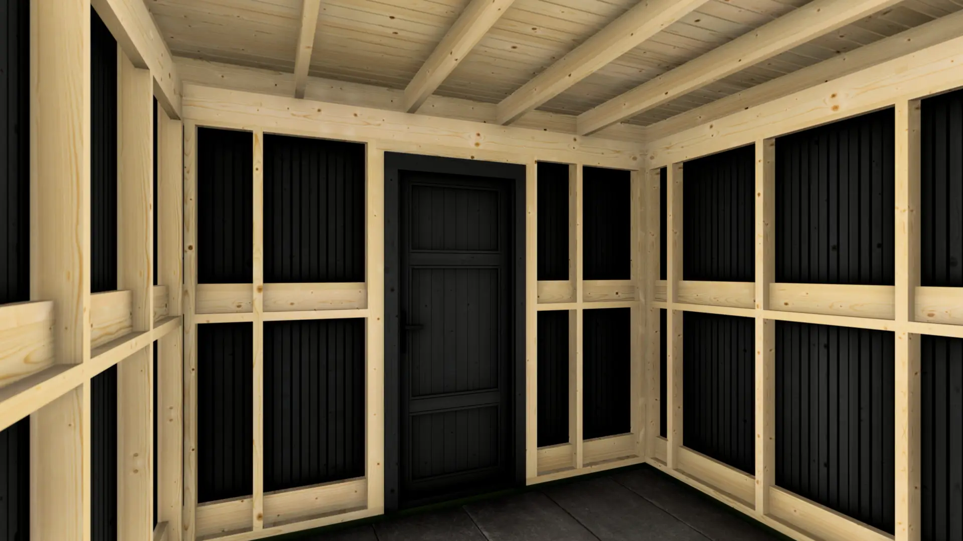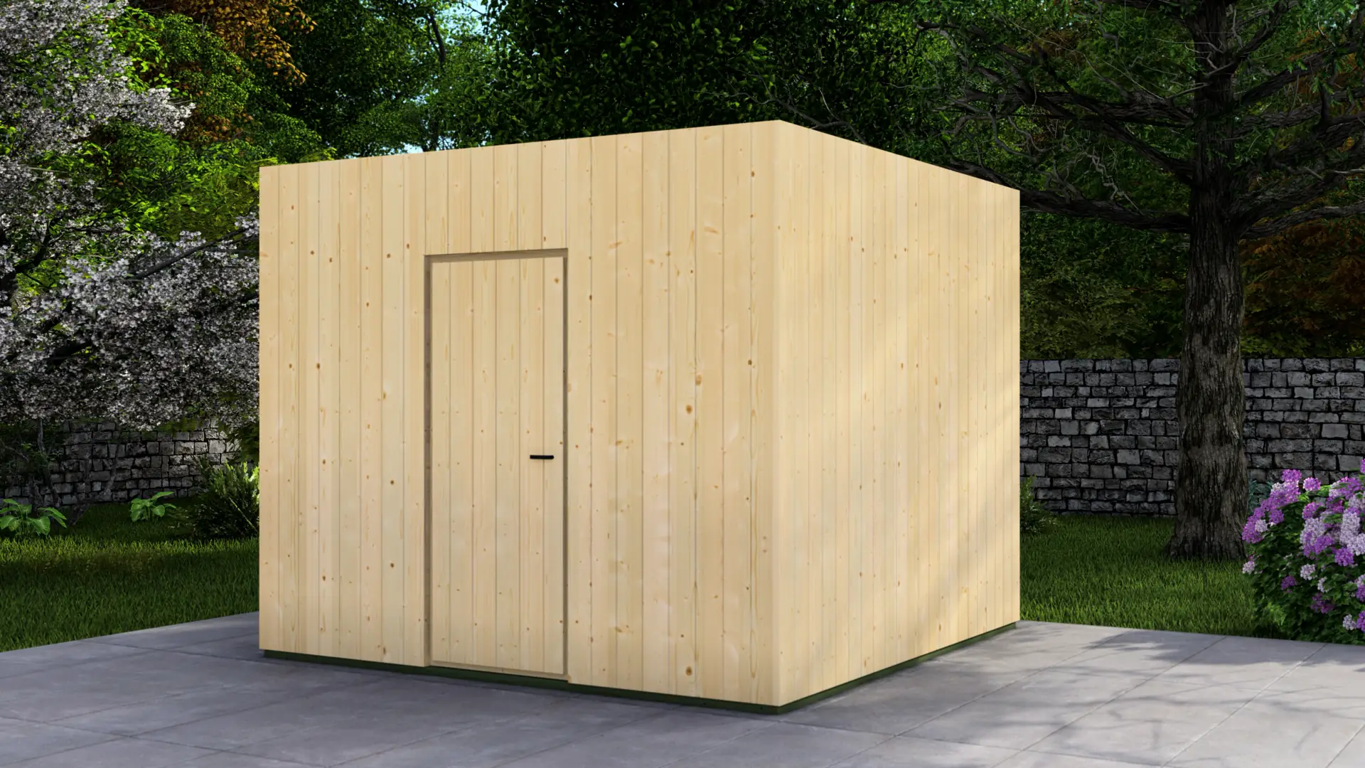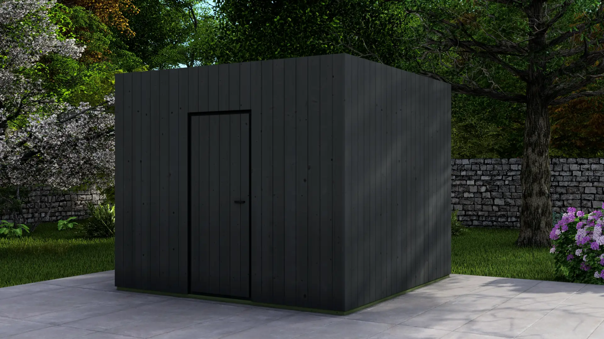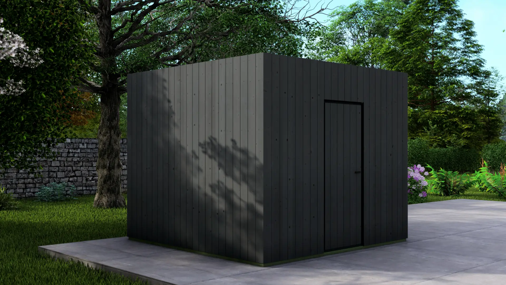 The Frame Cabin represents a modern approach to garden storage and utility space. Distinct from traditional log cabins, this structure utilizes a robust 95mm timber frame construction clad in vertical 18mm facade boards, creating a clean, contemporary cubic aesthetic that complements modern architectural styles. The building is capped with a durable flat roof system with a minimal, invisible slope to ensure efficient water runoff while maintaining its geometric profile.