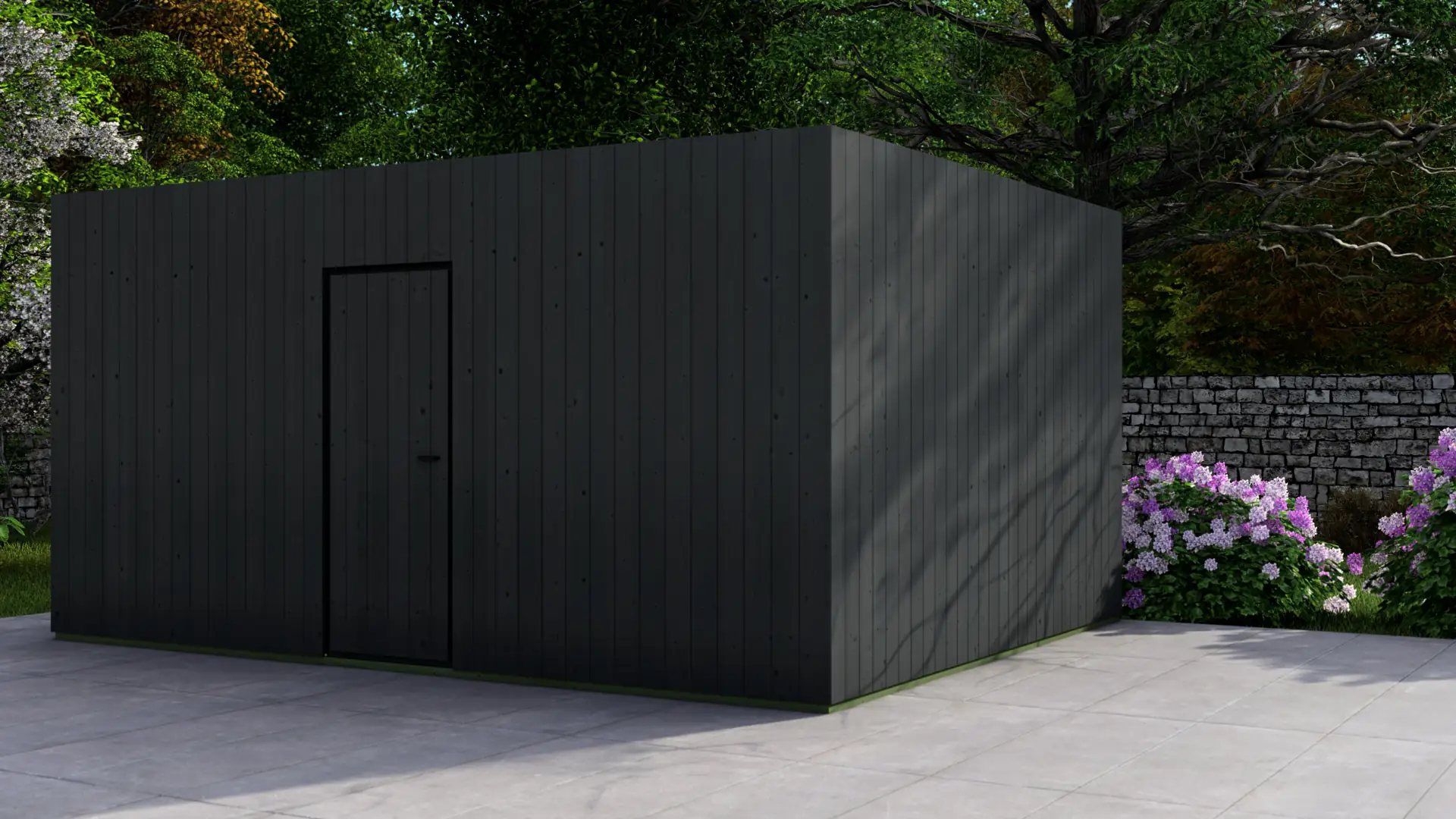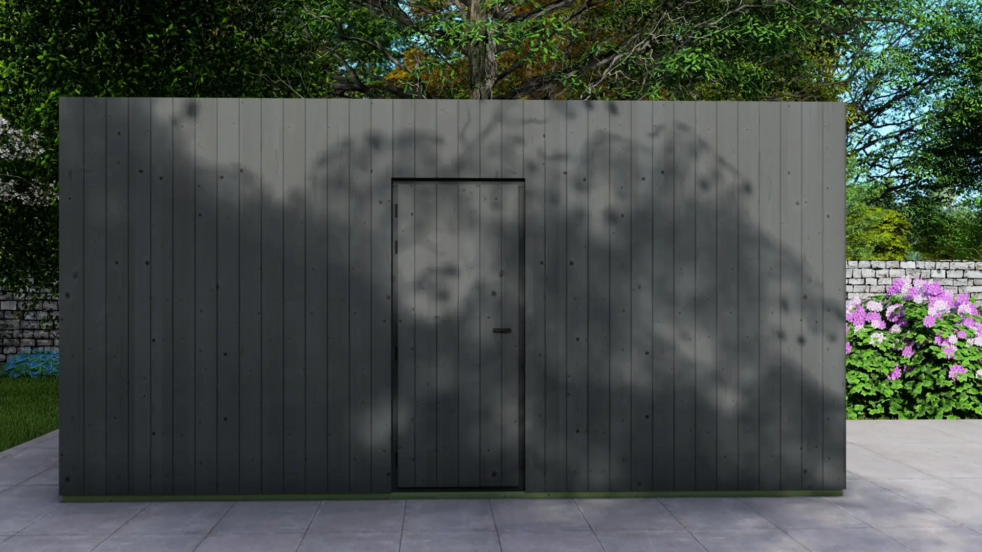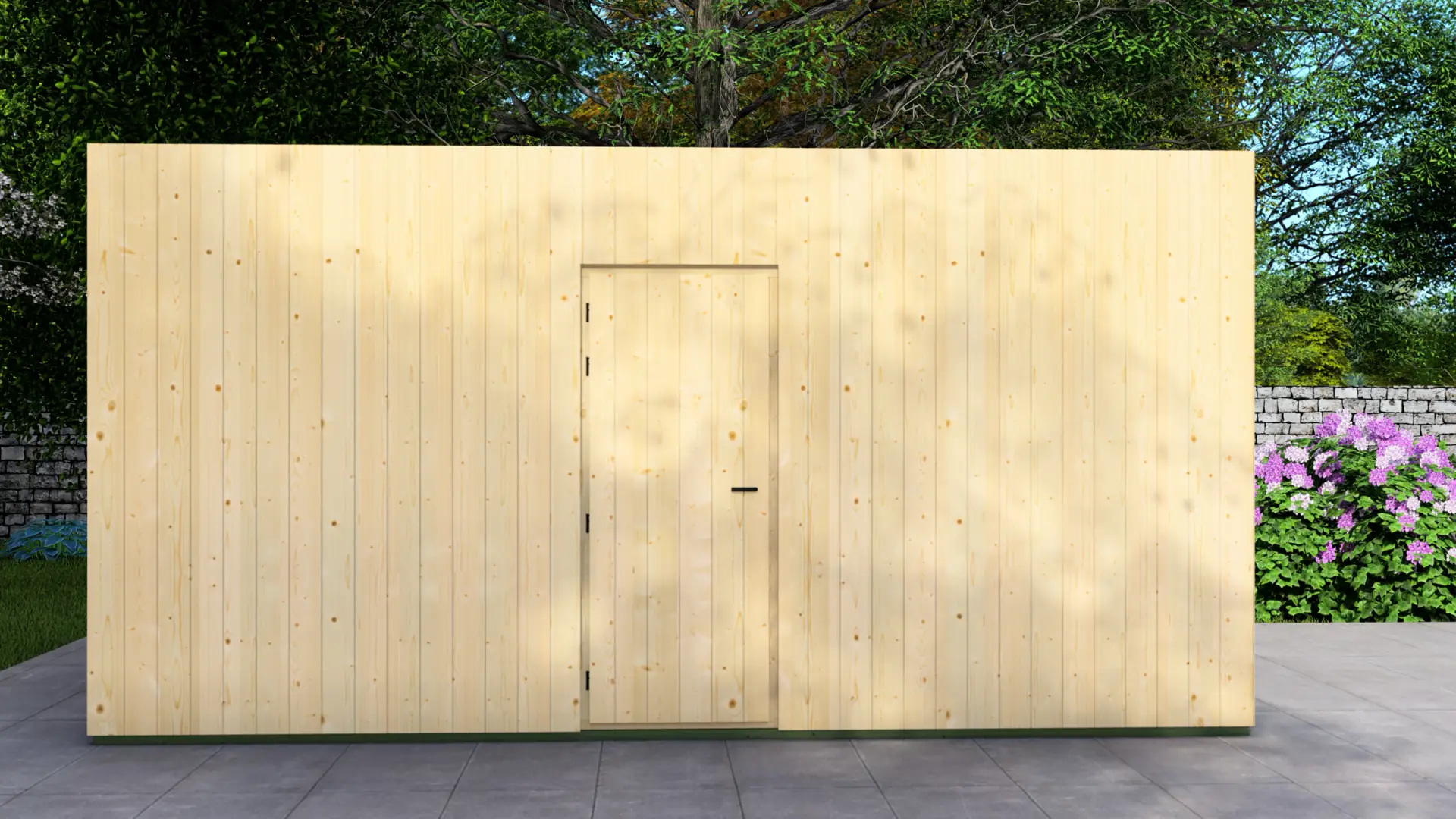 A clean, modern storage cabin with sharp lines and a calm timber finish. Around 18 m² of enclosed space keeps bulky items, equipment and seasonal clutter completely hidden from view, so the garden stays calm, uncluttered and refined year-round. Precision-cut spruce frame with 18 mm vertical Nordic spruce cladding delivers tight joints and a flawless, understated finish.