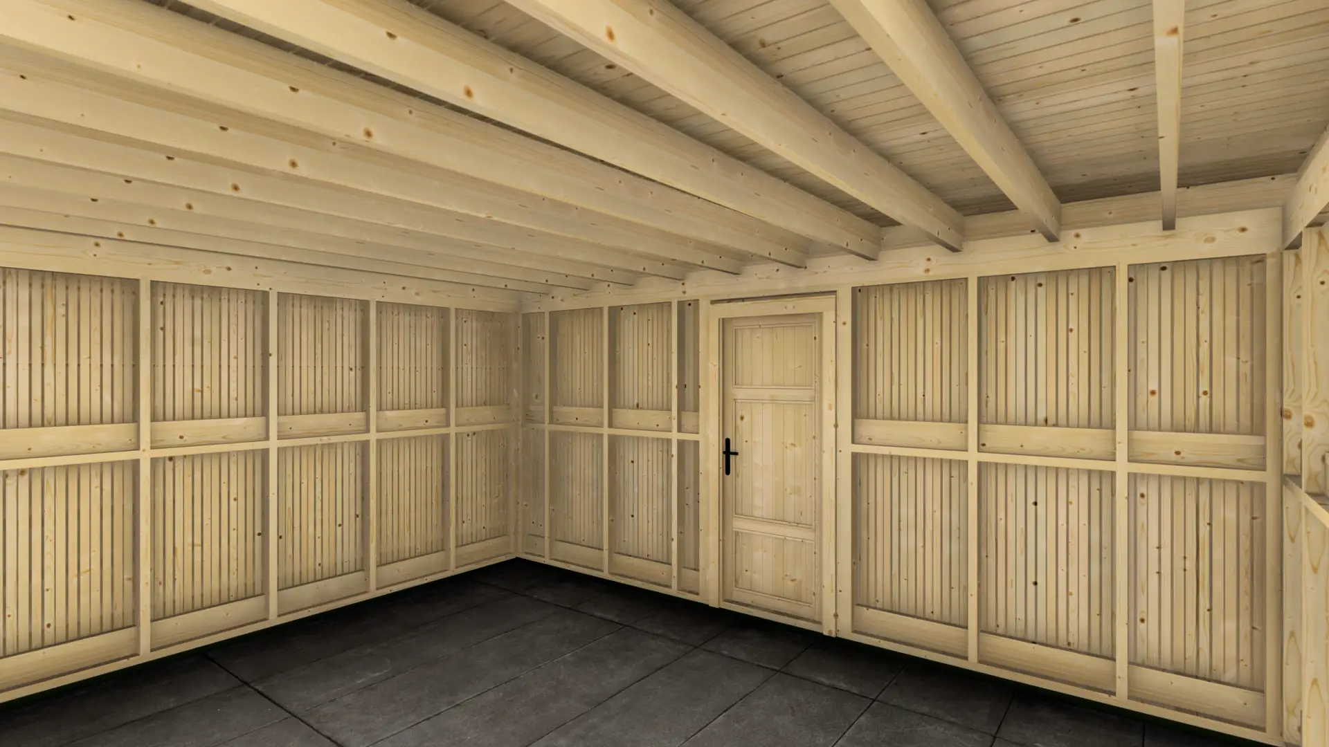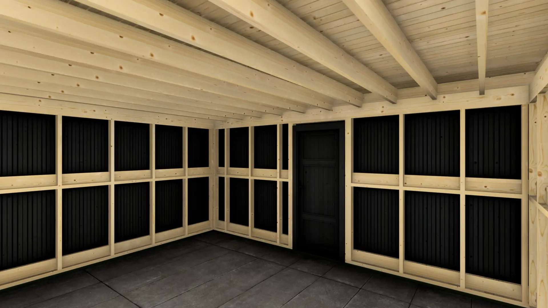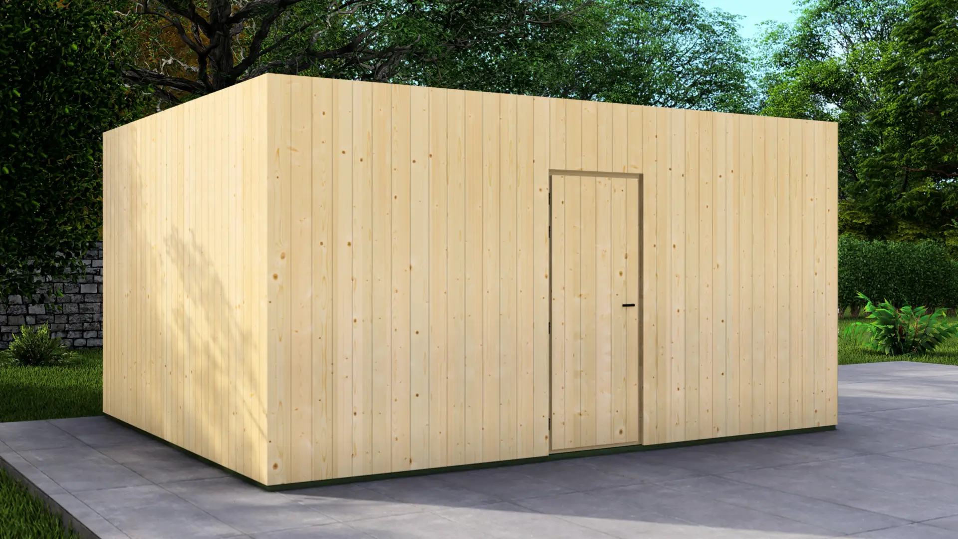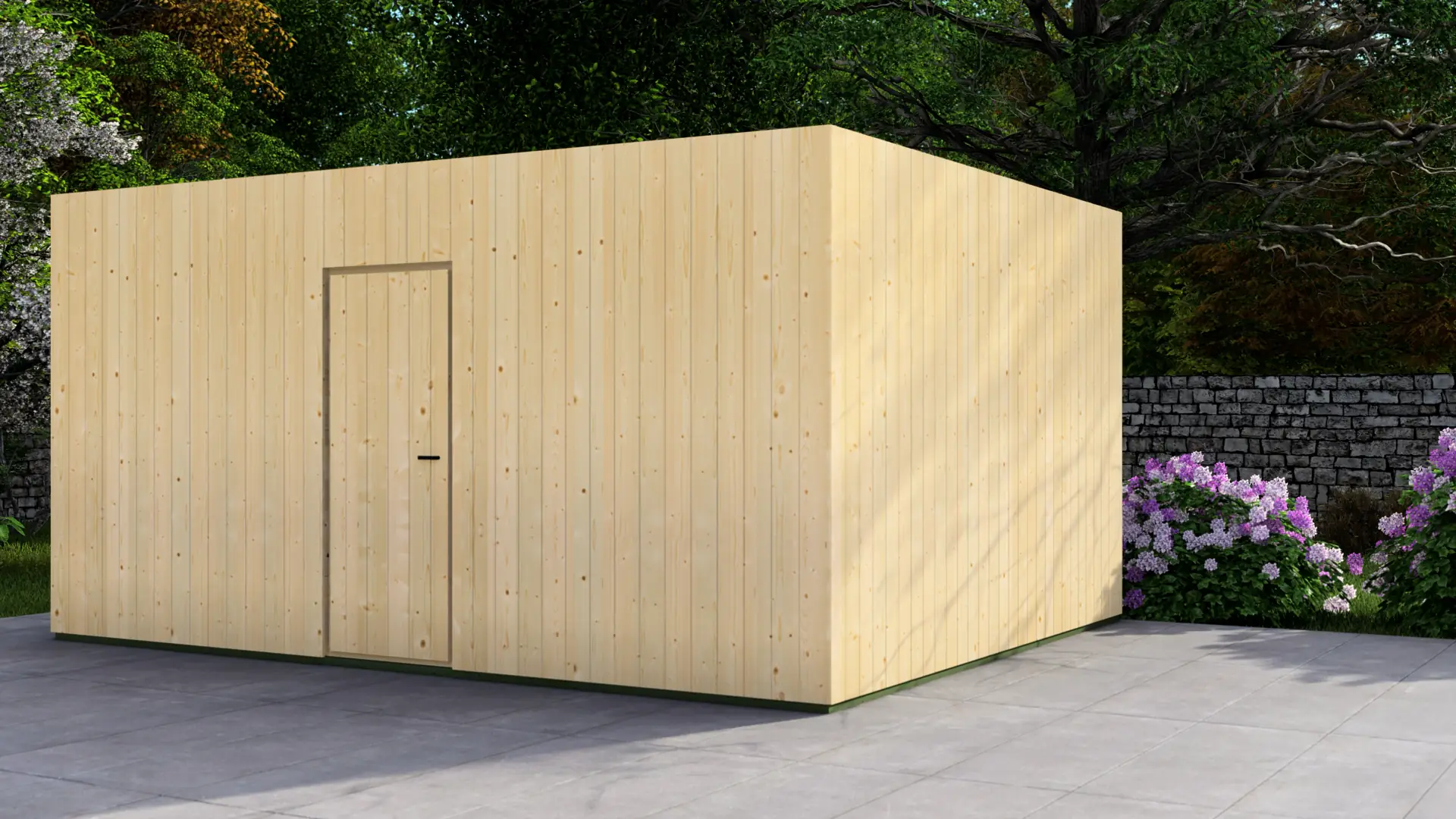 Built with a sturdy 95mm pre-cut spruce frame and sheathed in 18mm vertical tongue-and-groove cladding for superior structural rigidity and a modern look.