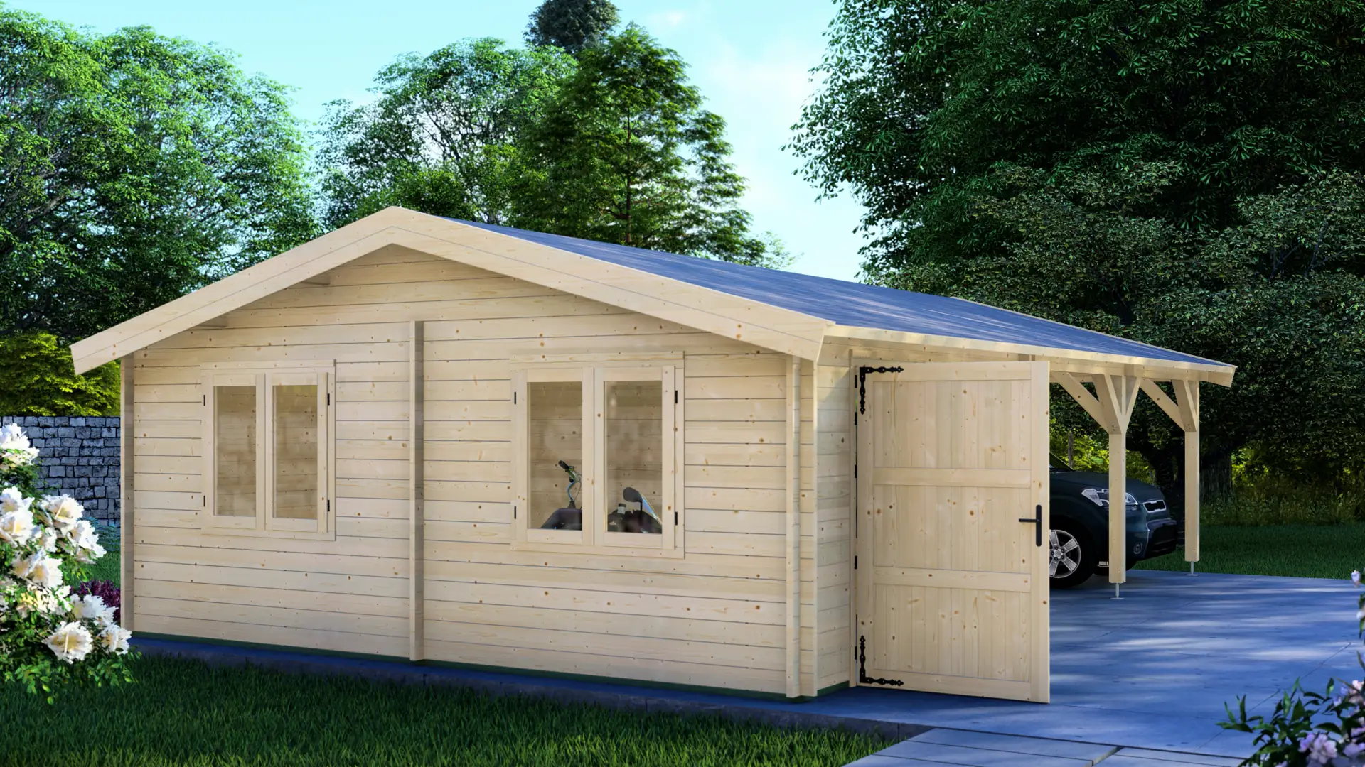 Made from solid 44mm Nordic spruce. The kit uses pre-cut, labelled parts, so everything goes together cleanly and accurately. Overall size is 4.00m × 5.95m (about 24m²), fully enclosed, and suited to 1 car with space for tools and equipment. Design features a modern flat roof with a slight slope for drainage, double garage doors, a side access door, and a window for natural light.