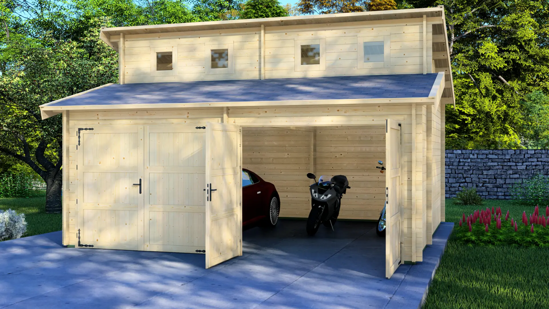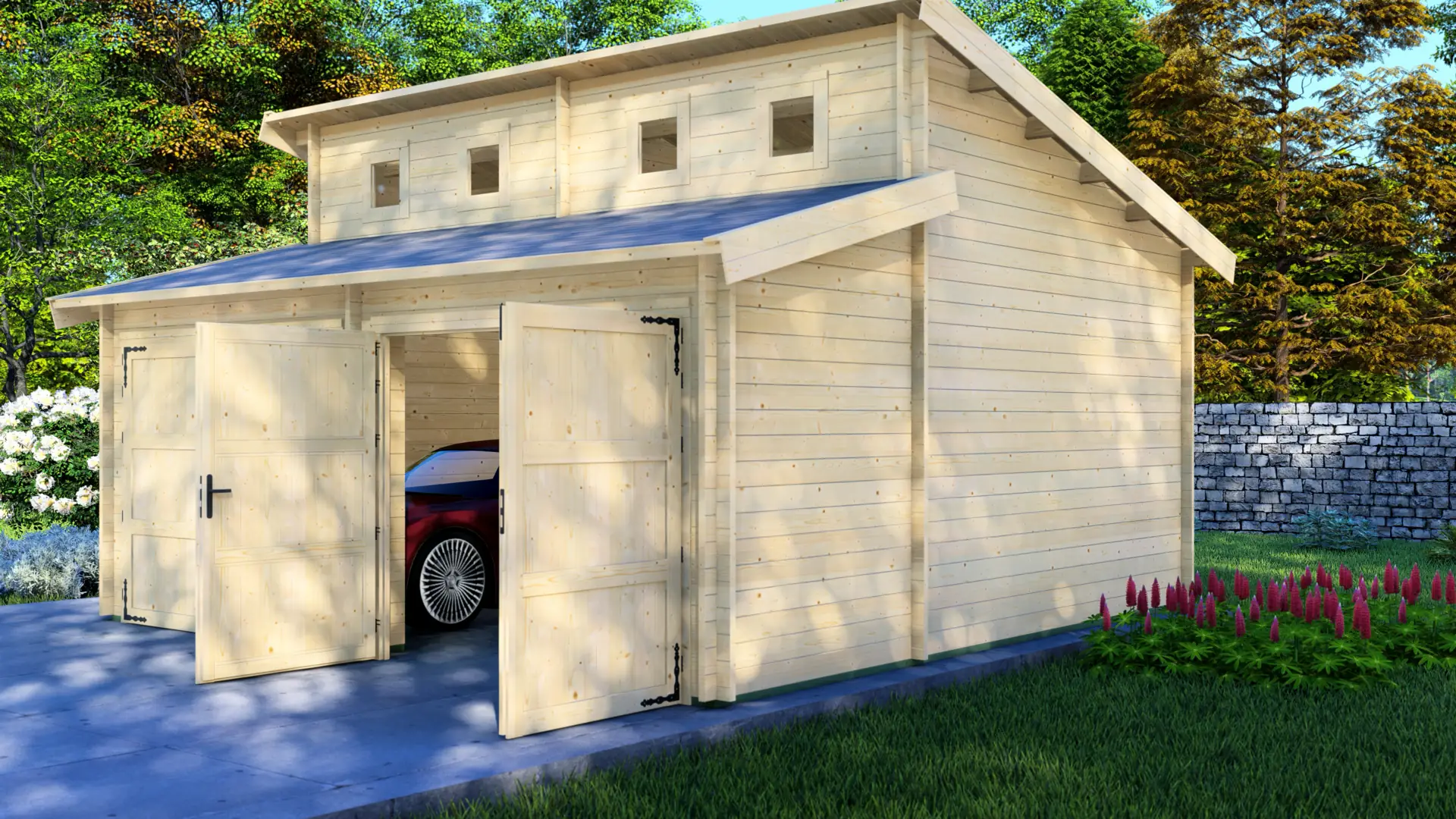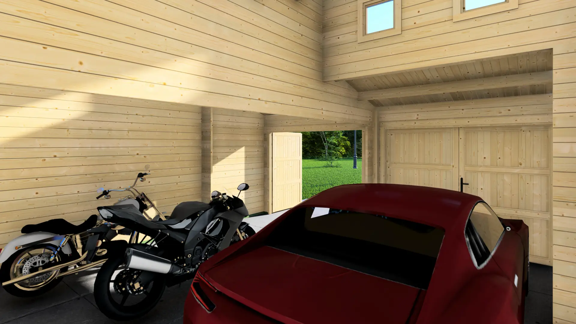 Beyond parking, the square layout provides useful storage space along the back and side walls. The higher window band brings in natural light for day-to-day tasks. For year-round workshop use, the structure can be upgraded with insulation and an internal lining.