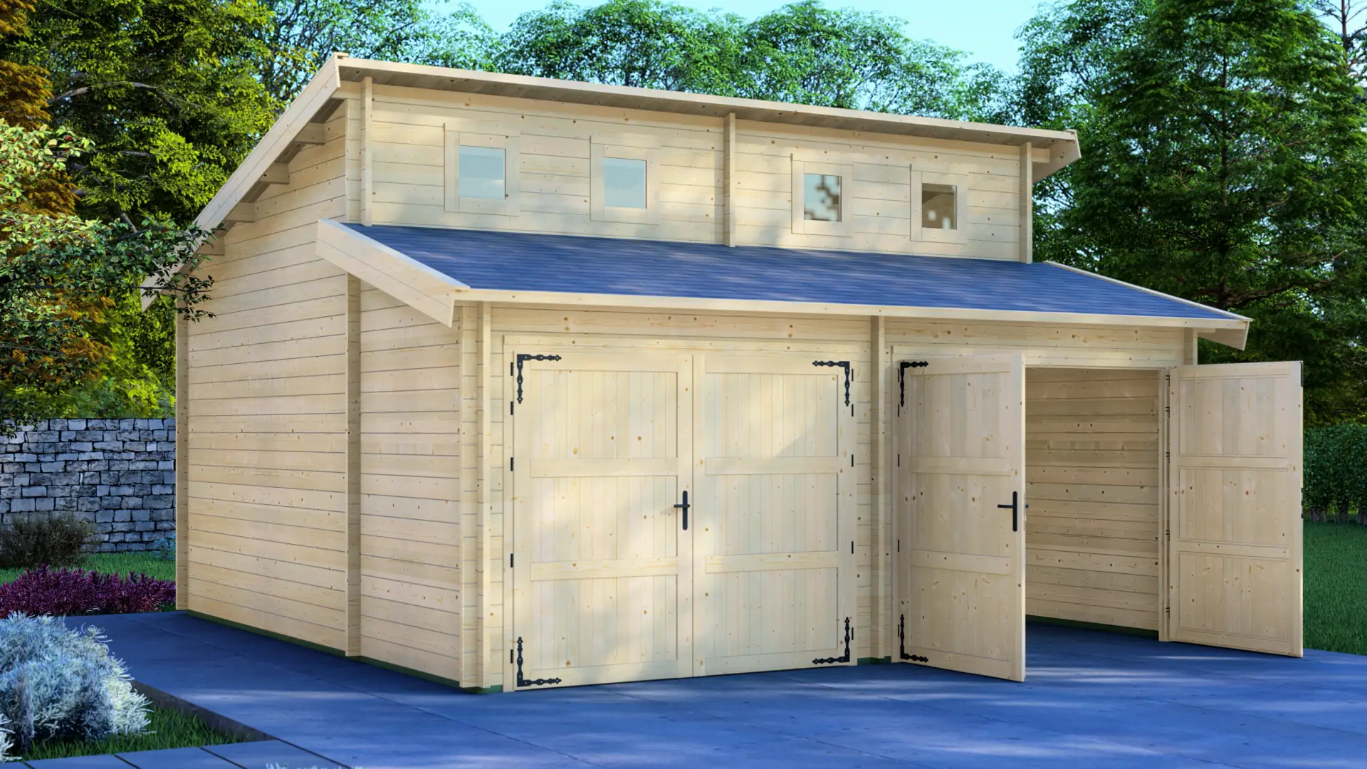 Garage Active Double 6×6 is a modern double garage with a distinctive raised roofline. The high-level windows add a brighter, more open feel inside, while keeping privacy and leaving the lower walls free for shelving and storage.