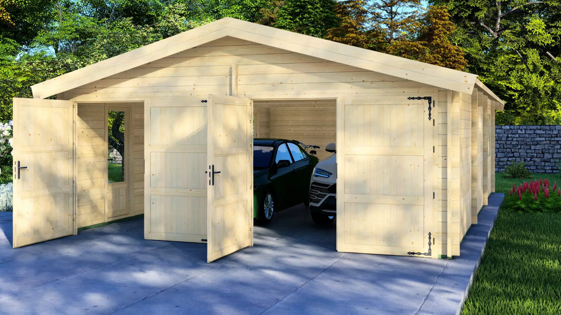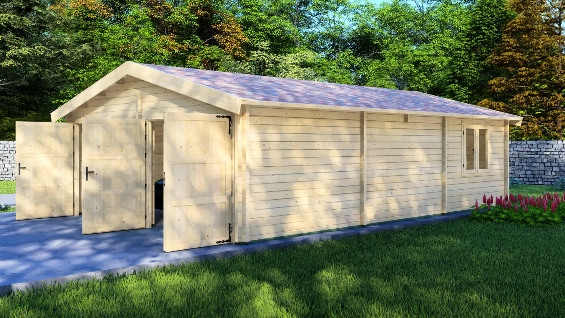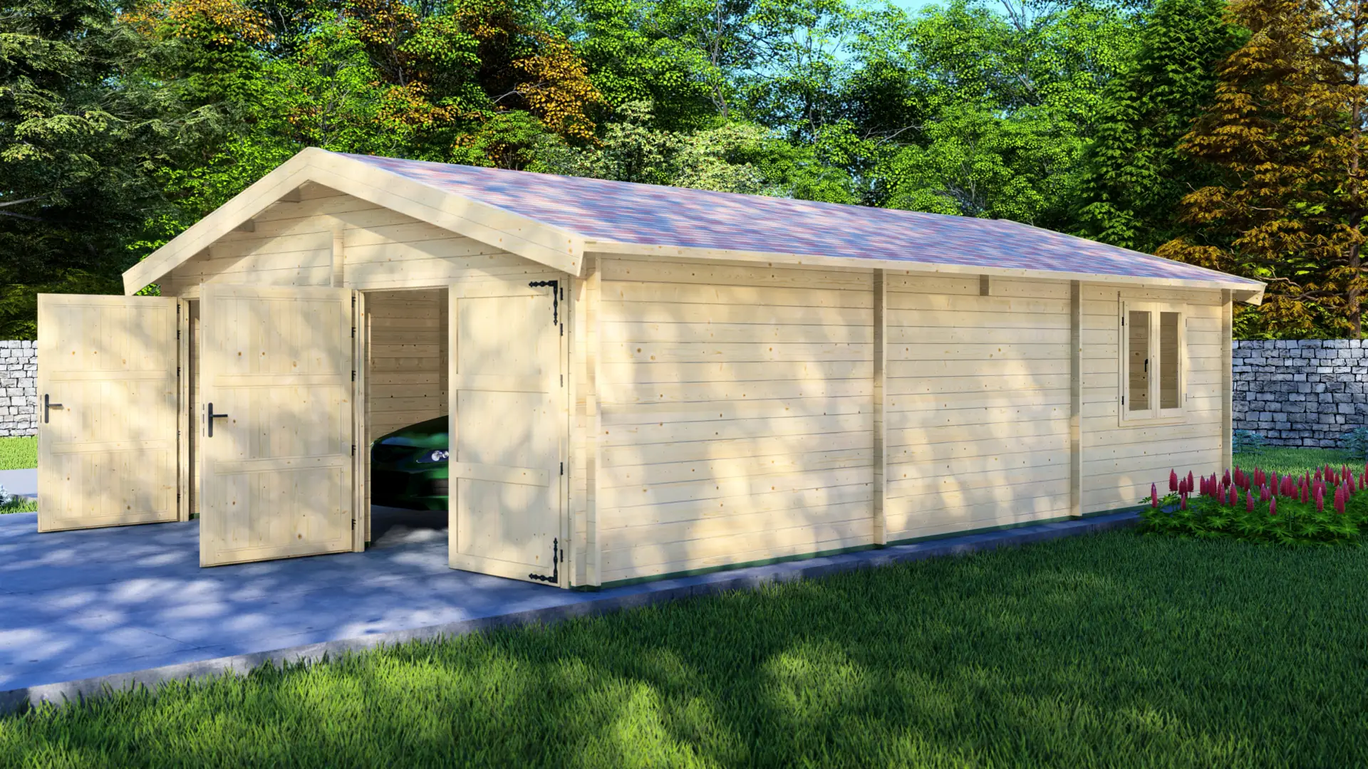 This model features a dual-entrance front elevation with two robust garage gates, complemented by a dedicated pedestrian side door and two double-glazed windows to ensure ample natural light. The precision-engineered tongue-and-groove system ensures a wind-tight fit, while the 18mm roof boards provide a solid foundation for your choice of roofing material. Whether used for car storage, a hobby space, or industrial utility, this garage provides a durable, professional-grade environment.