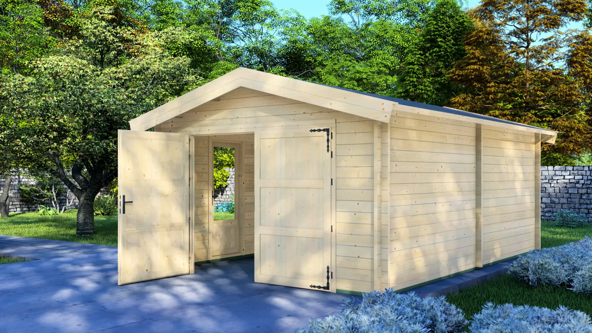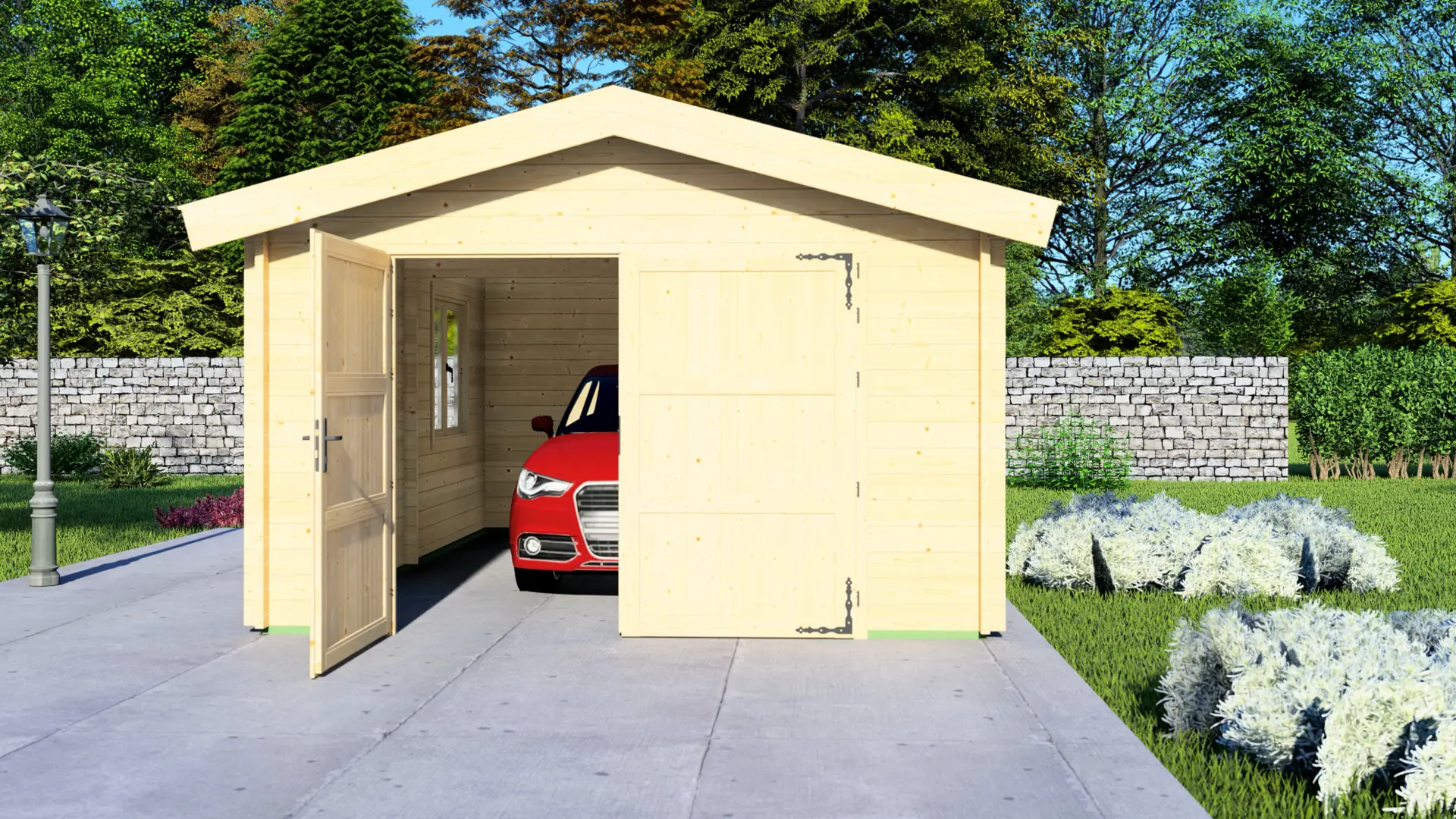 Made from solid 44mm Nordic spruce. The kit uses pre-cut, labelled parts, so everything goes together cleanly and accurately. Overall size is 4.00m × 5.95m (about 24m²), fully enclosed, and suited to 1 car with storage along the walls. Design features a classic pitched roof, double garage doors, a side access door, and a window for daylight.
