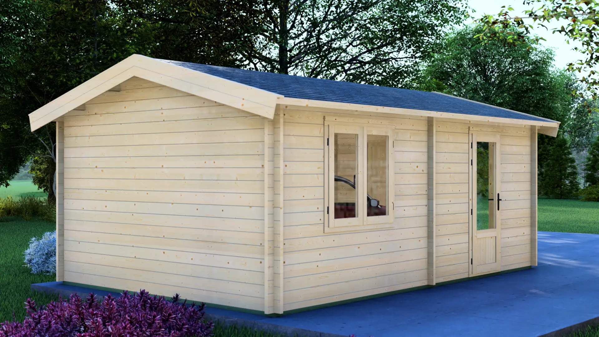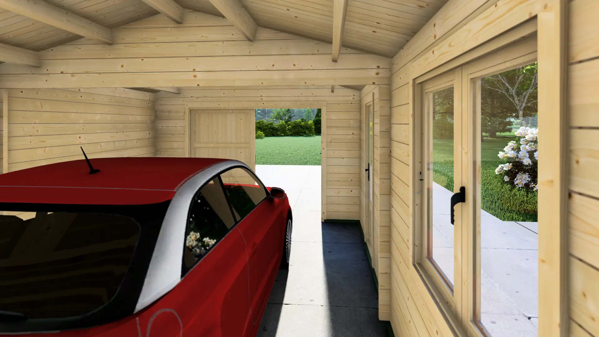A wide, barn-style garage with a strong, classic profile and a spacious feel from the moment the doors open. Built from 44mm Nordic spruce, it measures 5.95m × 5.95m (about 35m²) and is fully enclosed for 1 car with generous storage space. Includes double garage doors, a side access door, and multiple windows for daylight.