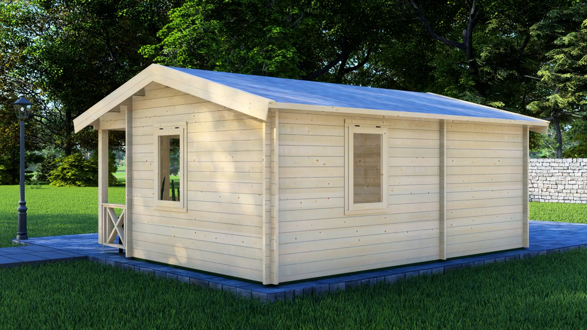 The Little Excited cabin offers 18m² of enclosed space in a compact 4×5m footprint. This Nordic spruce cabin features an L-shaped corner entrance, two large double-leaf windows, and your choice of 44mm or 68mm wall thickness. The traditional apex roof and efficient layout suit clients seeking a dedicated hobby space, home office, or seasonal retreat without excess square meterage.