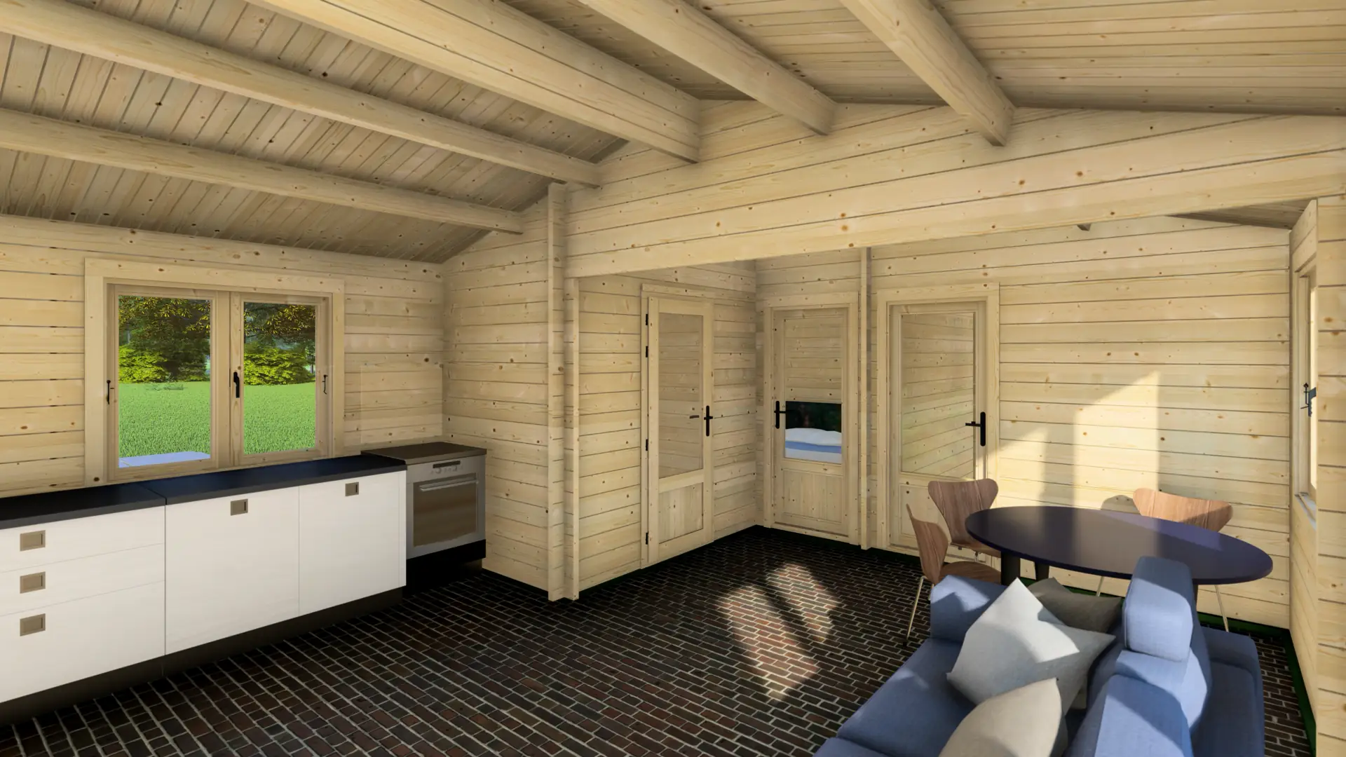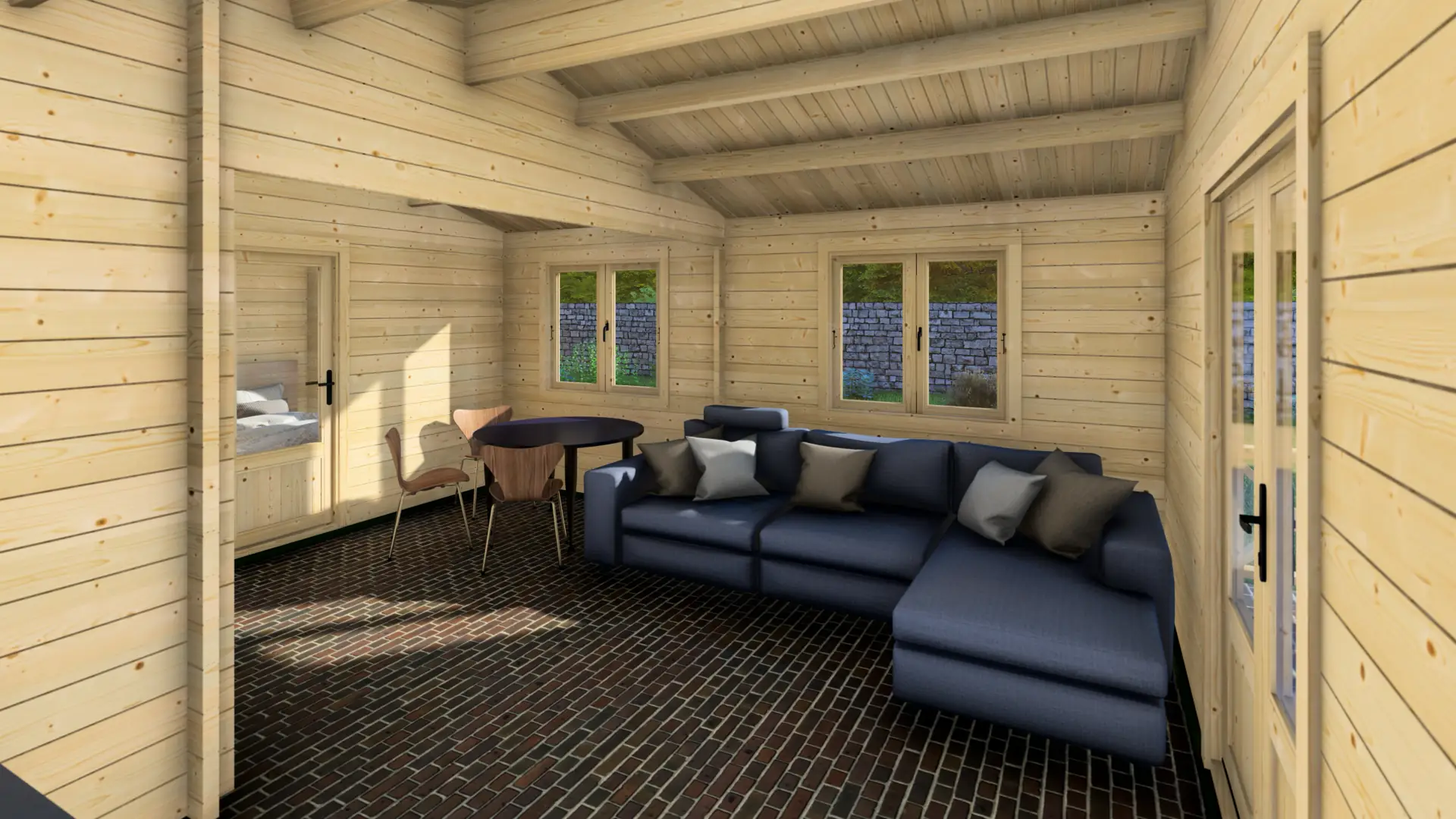 Four distinct interior spaces work for living room, bathroom, and two bedrooms—or home office, studio, guest space, and storage. This room separation is rare in garden buildings and ideal for those who need distinct functional zones.