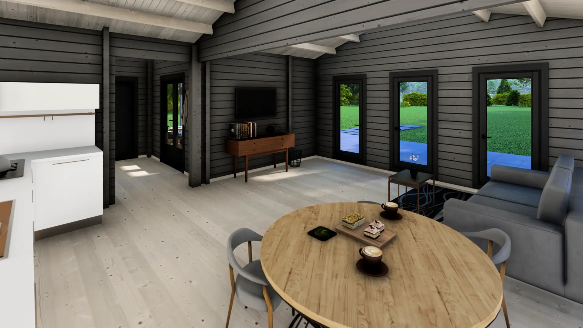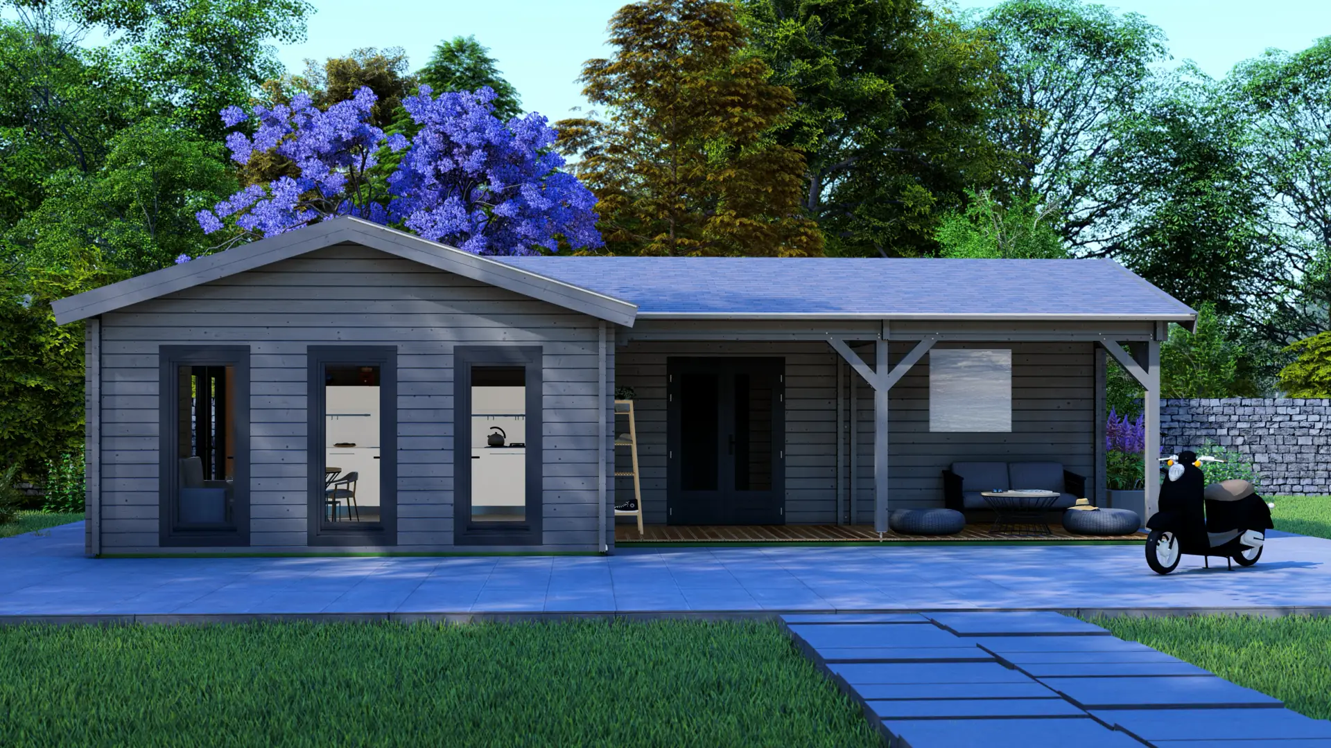 Jolly is a 58m² log cabin designed for end-users who need proper year-round performance and the square meterage to match. With 46m² of enclosed living space divided into a large open-plan area, separate bedroom, and bathroom, plus a 12m² covered terrace under the main roofline, this model delivers high-value footprint and functionality.