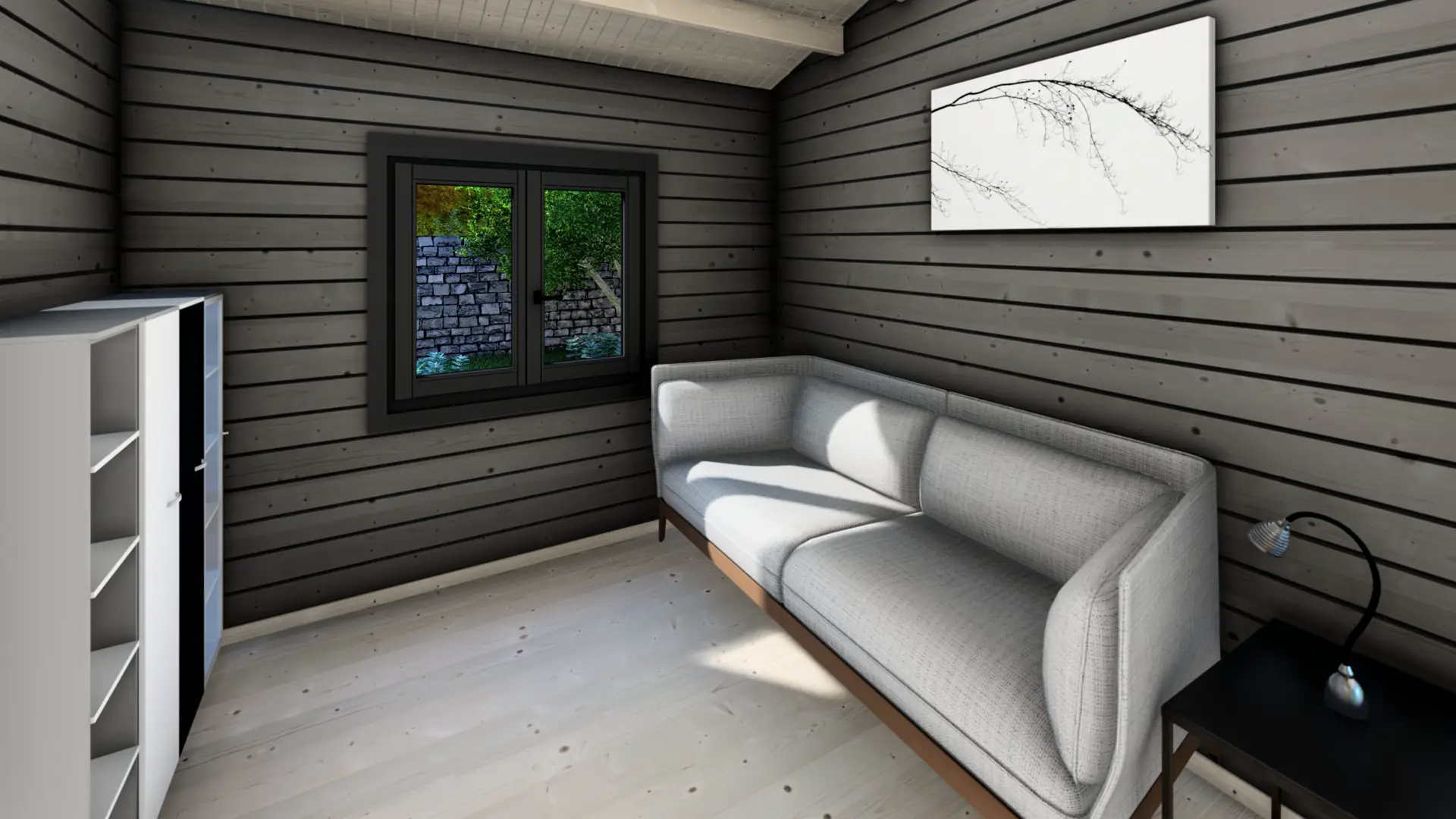 The Jumpy spans 24m² in an elongated 3×8m footprint, dividing into two enclosed rooms (9m² and 6m²) with a central open zone. This Nordic spruce cabin's linear layout fits naturally along property boundaries whilst offering remarkable internal flexibility. Available in 28mm or 44mm wall profiles with contemporary pent roof styling.