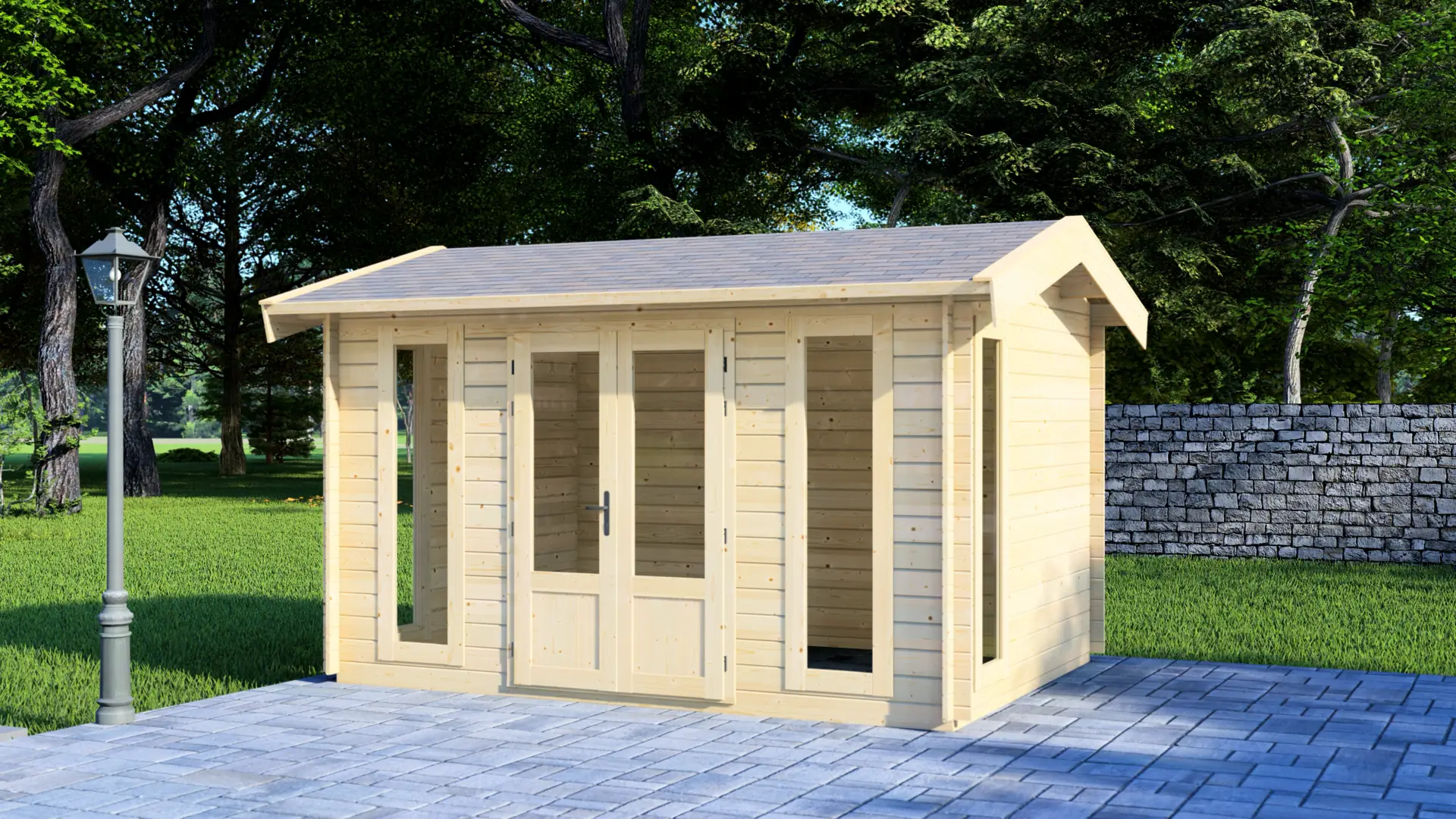 At 4.0×3.0m, the Pleasure cabin fits comfortably in smaller gardens or tight side-yard spaces where larger models won’t work. The compact dimensions also reduce foundation preparation costs and make site access easier during delivery and installation—practical advantages for urban or densely-developed residential areas.