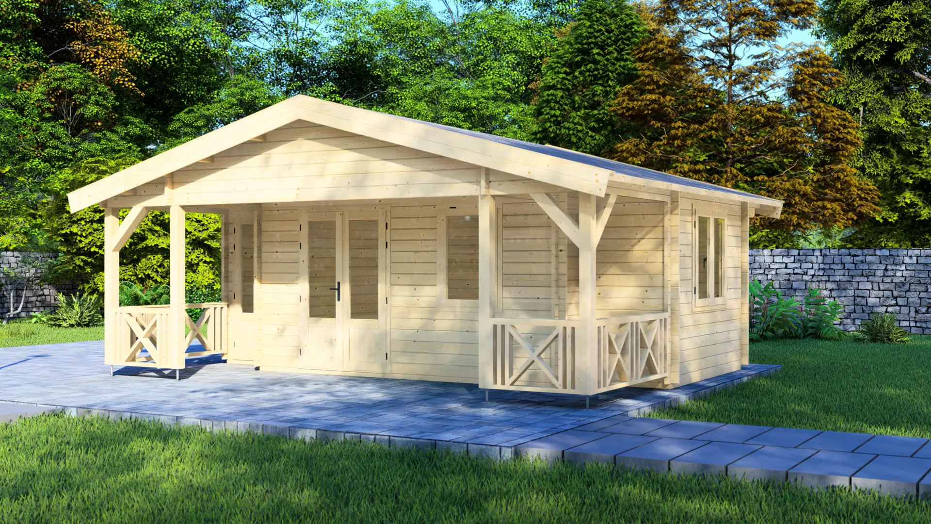 Spacious 53m² timber log cabin with 30.7m² indoor living space plus 18.2m² covered terrace. Built from Nordic spruce with choice of 44mm or 68mm walls and apex roof reaching 309cm ridge height. Studio-style interior with six windows provides abundant natural light. Great for guest accommodation or holiday retreats. Customize layout, glazing, and features via online configurator with instant quotes.