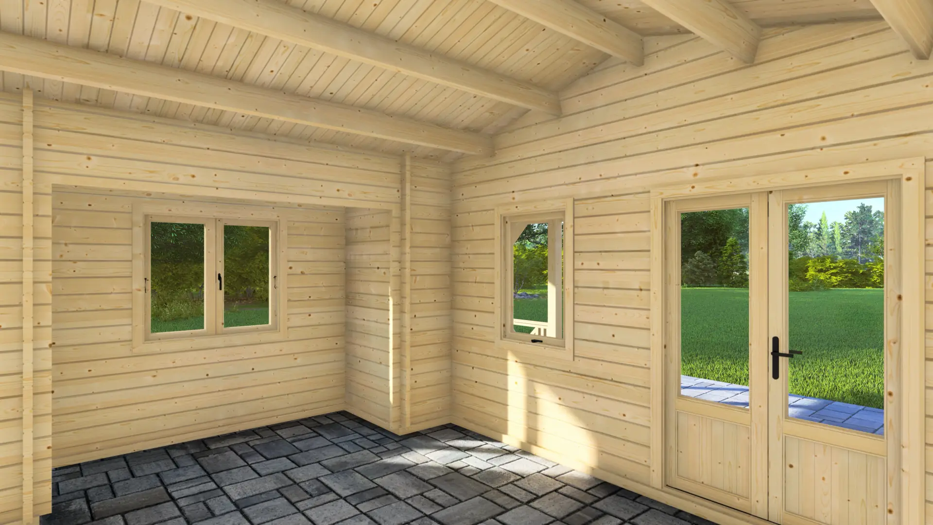 Choose between 44mm walls for moderate climates or 68mm for enhanced insulation and year-round comfort. Both specifications use solid Nordic spruce with traditional apex roof geometry that provides proper ceiling height and effective water runoff. The double-glazed windows and doors maintain brightness whilst improving thermal performance over single-pane alternatives.