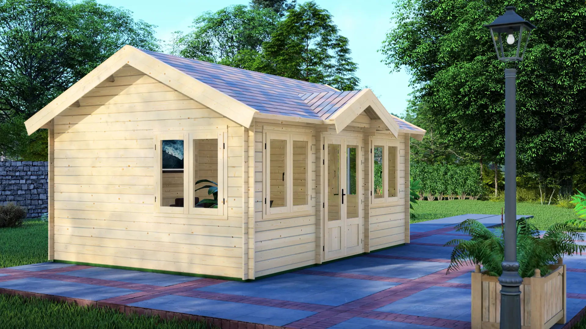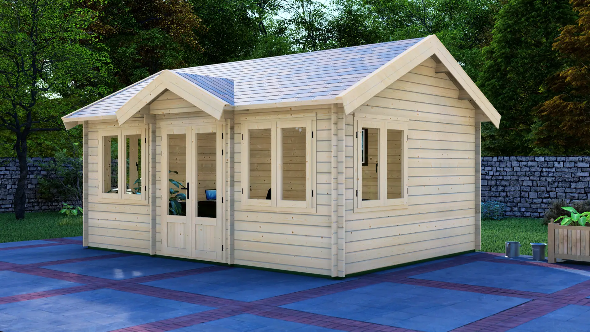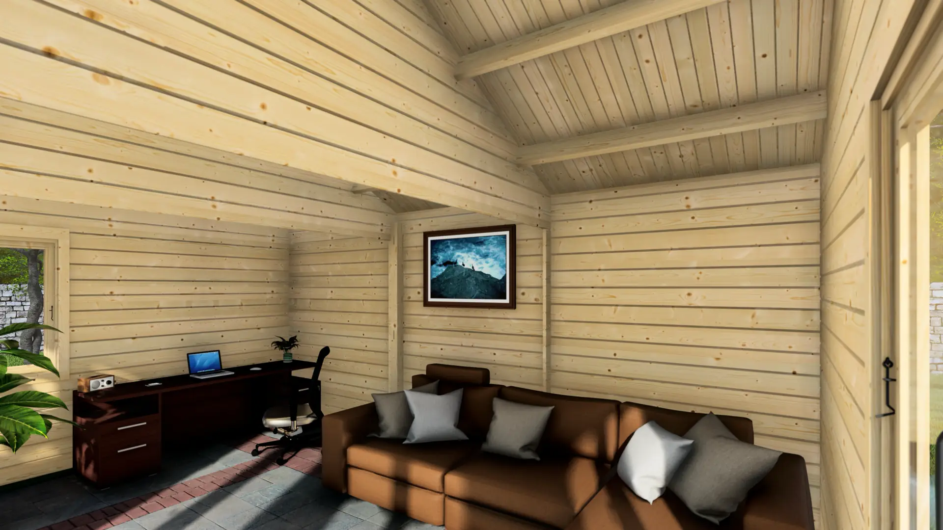 The Sympathy delivers a classic log cabin aesthetic with contemporary light levels. Four generously sized double-leaf windows paired with glazed double doors flood the 22m² interior with natural daylight, making it particularly attractive for home office, art studio, or therapy room applications where good lighting is essential.
