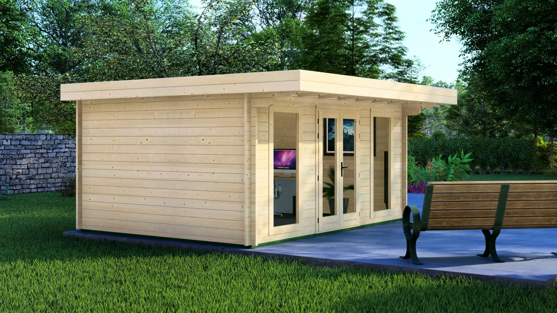 Modern 17.3m² garden building with 44mm Nordic spruce walls and floor-to-ceiling windows. Features a contemporary flat-roof design ideal for a home office or art studio.