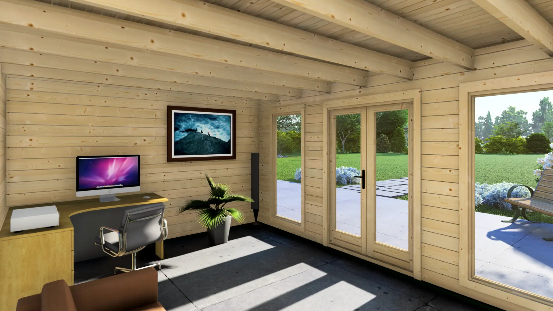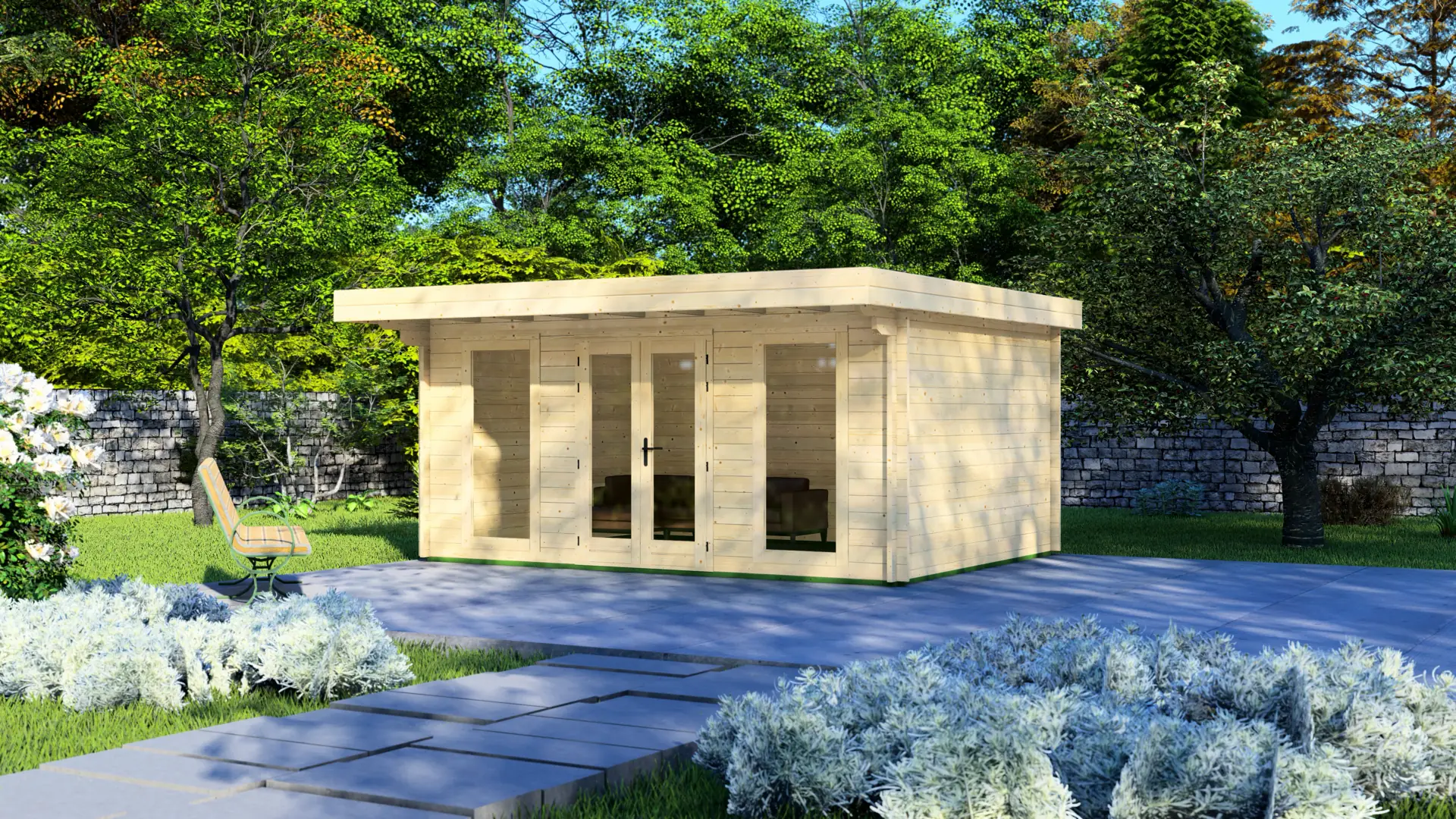 The Sympathy offers a bright, fully enclosed 22m² interior with classic apex roof styling and exceptional natural light from four large windows plus glazed double doors. This Nordic spruce cabin suits clients seeking a traditional garden room for office, studio, or guest space use. Available in 28mm, 44mm, or 68mm wall profiles to match seasonal or year-round requirements.