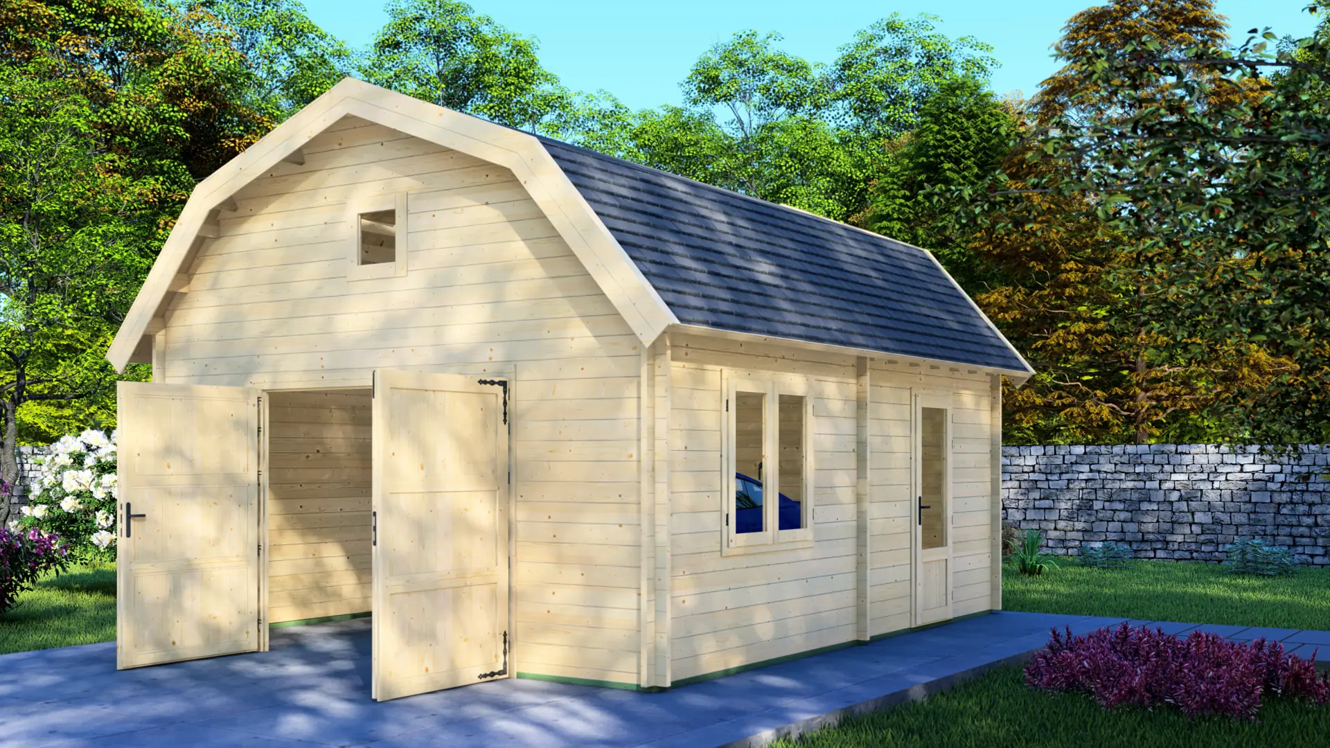 A wide, barn-style garage with a strong, classic profile and a spacious feel from the moment the doors open. Built from 44mm Nordic spruce, it measures 5.95m × 5.95m (about 35m²) and is fully enclosed for 1 car with generous storage space. Includes double garage doors, a side access door, and multiple windows for daylight.