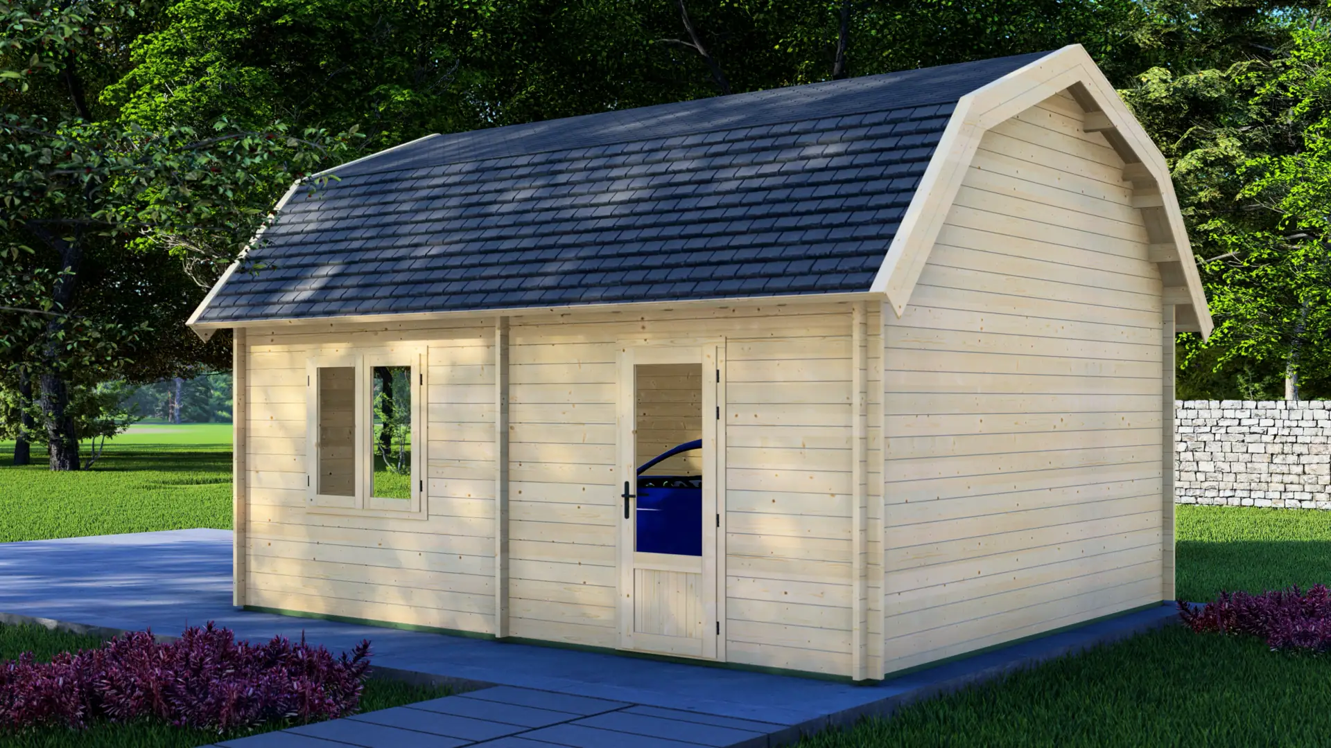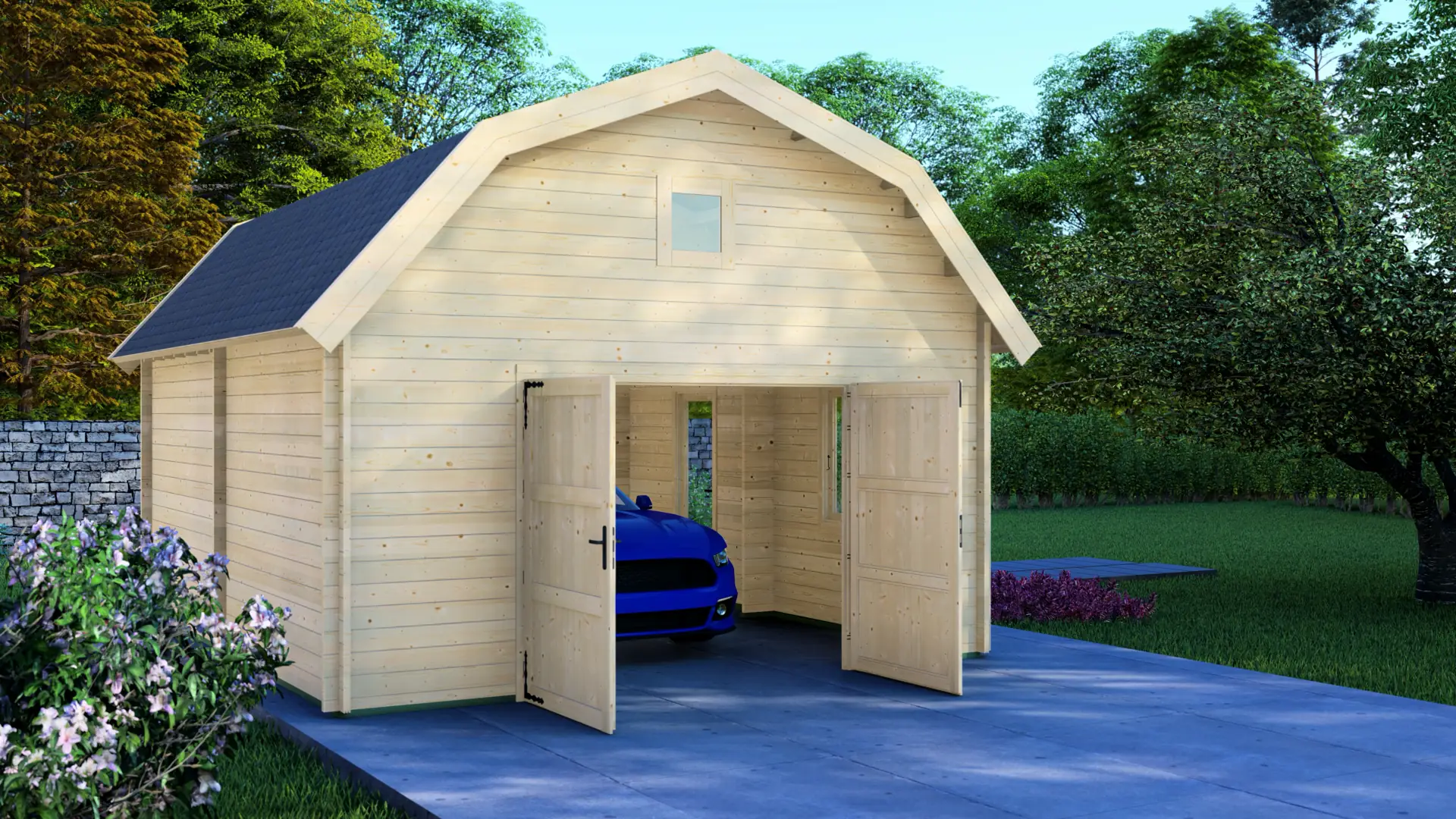 With its gambrel roof and loft-style character, this garage has a traditional, premium “barn” feel and extra height inside. It’s made from 44mm Nordic spruce and measures 5.00m × 5.95m (about 30m²), fully enclosed for 1 car plus storage. Includes double garage doors, a side access door, a window, and a 13m² mezzanine.
