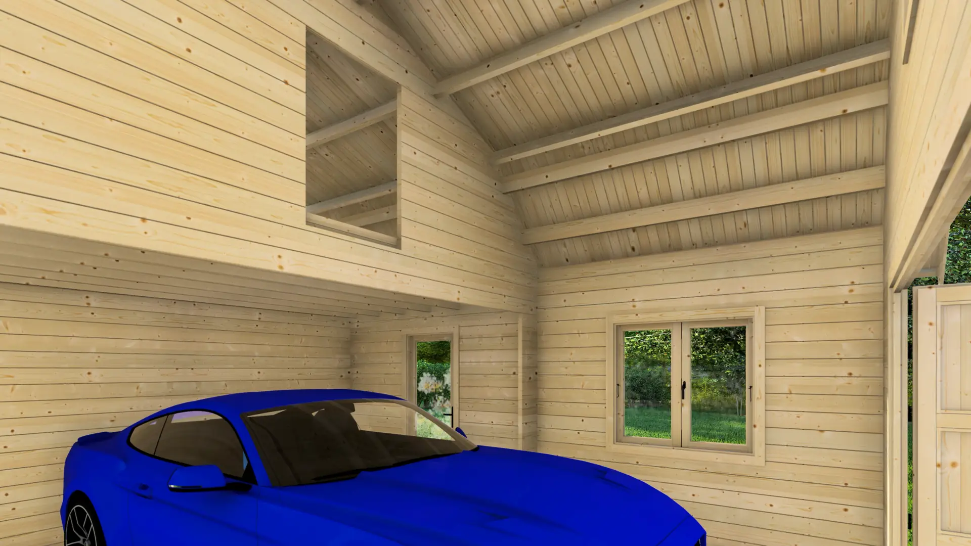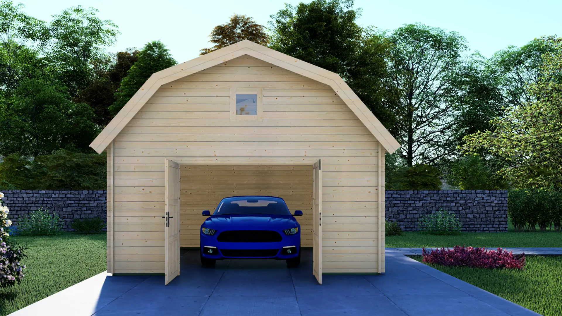 This model features a wide double-leaf timber garage door for easy vehicle access, alongside a glazed pedestrian door for convenient daily use. A side window adds natural light to the interior. The inclusion of a mezzanine floor maximizes the vertical space, turning the roof void into a practical space.