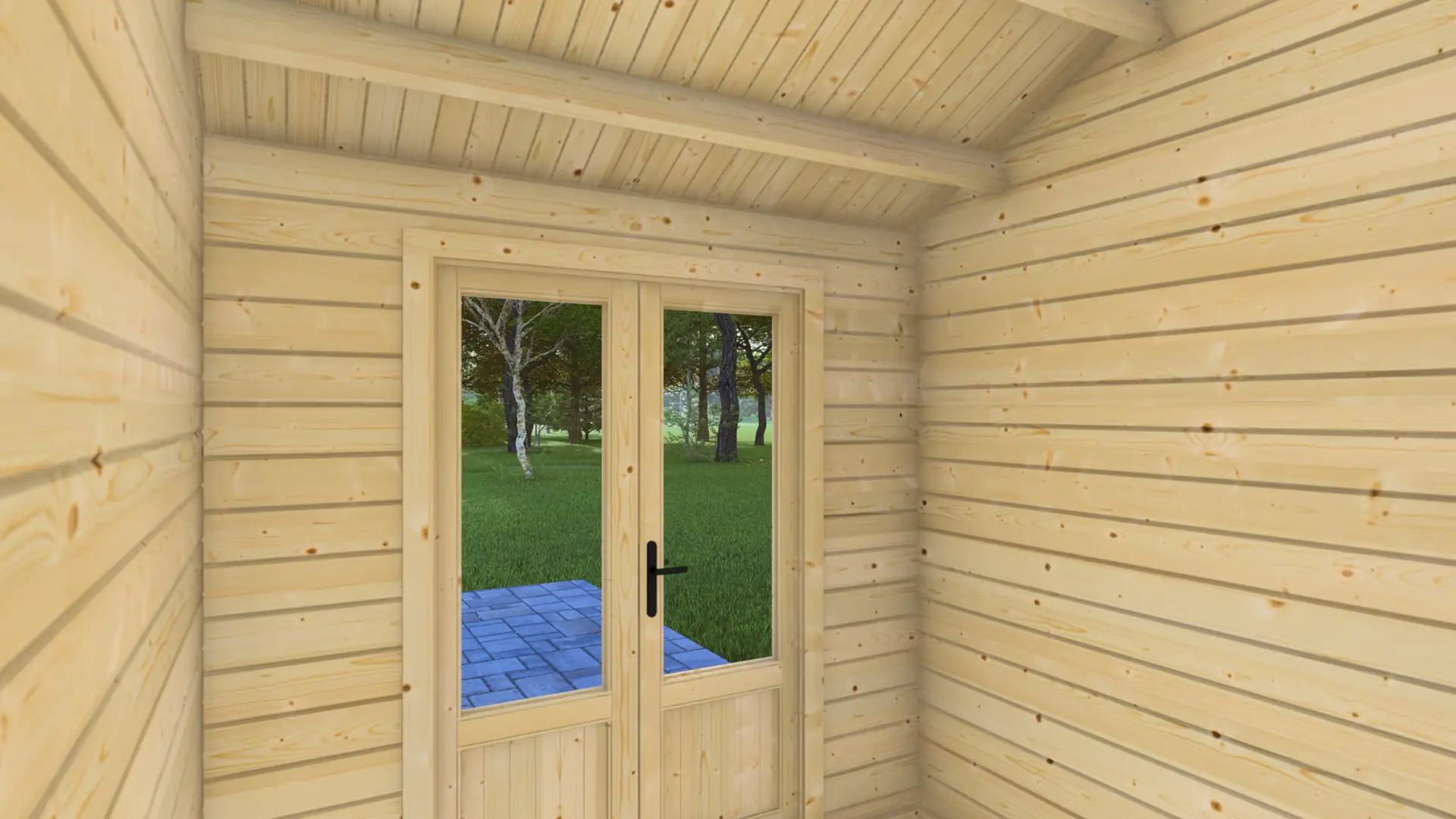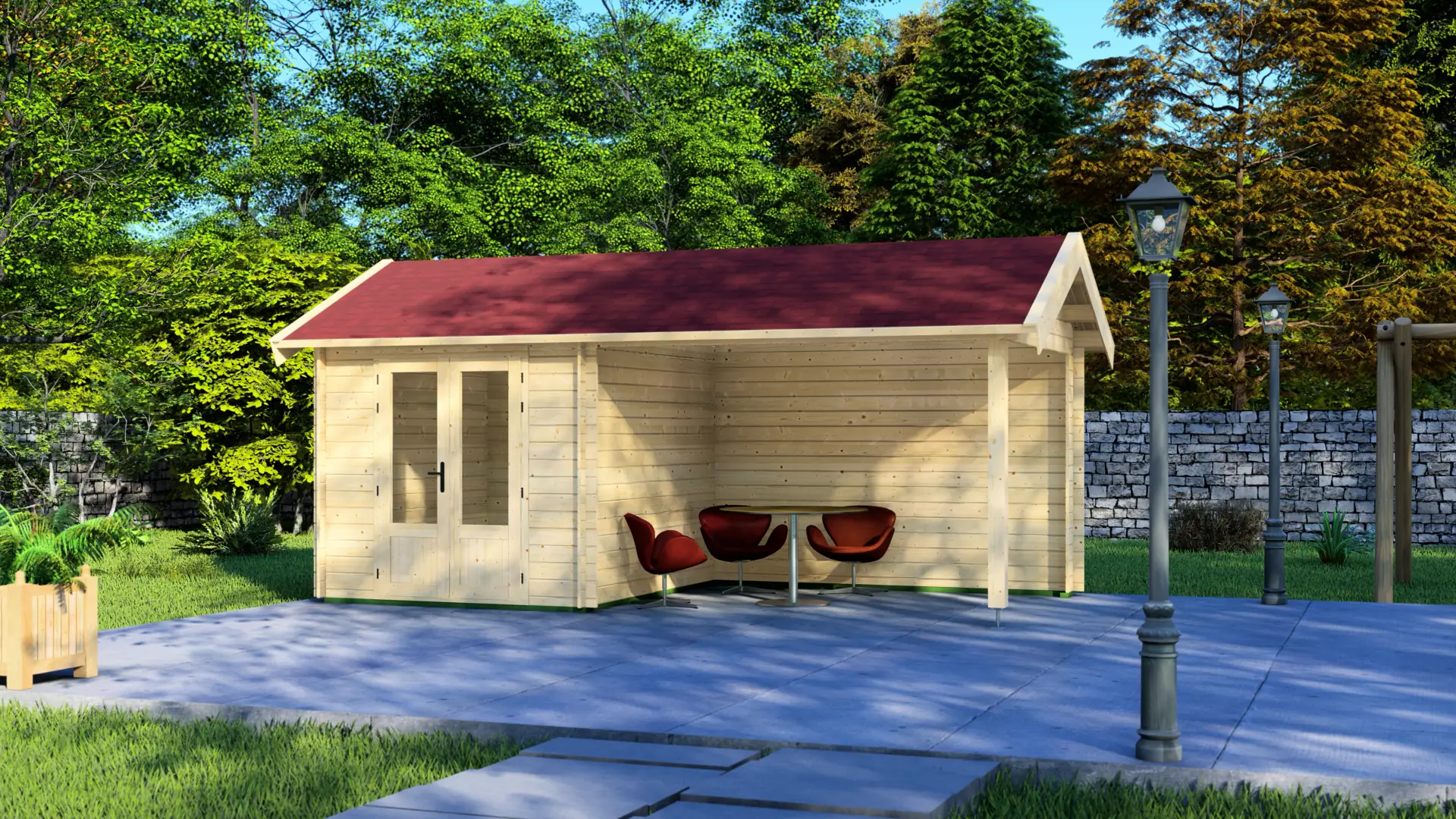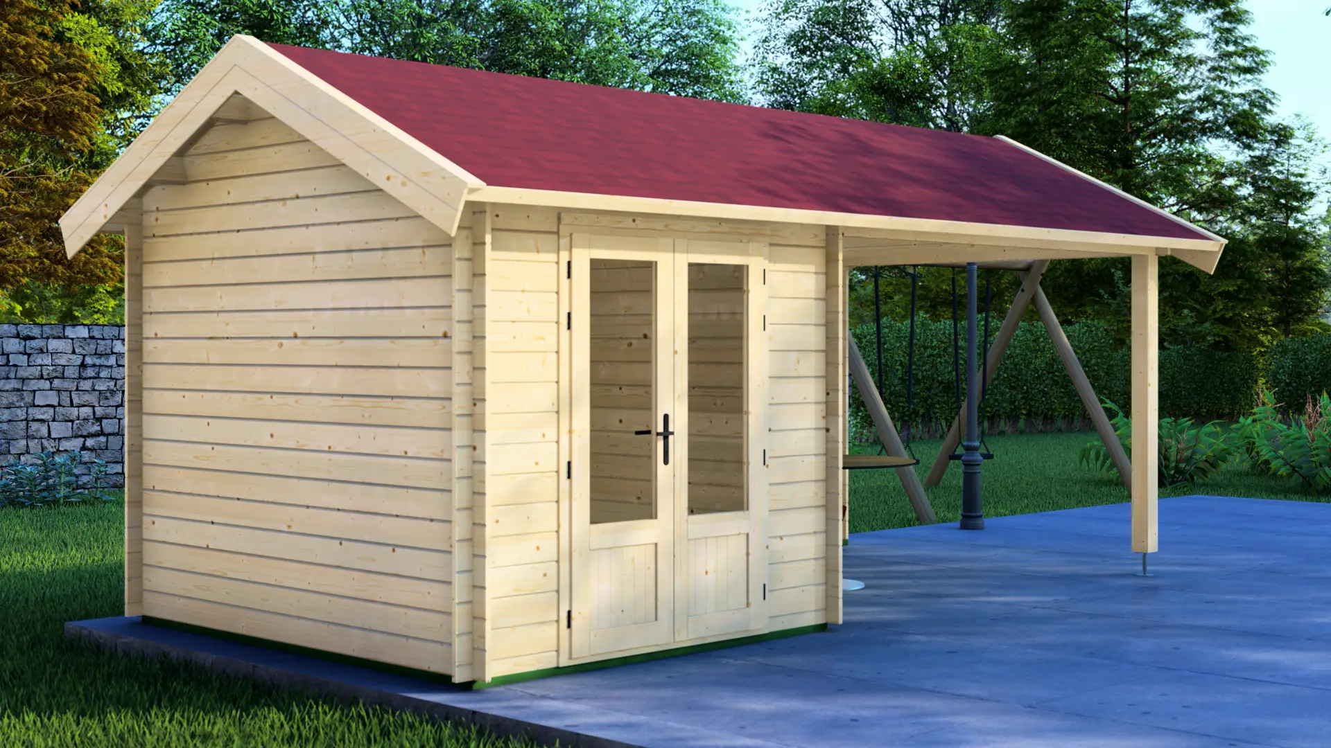 Position this cabin beside a pool or jacuzzi and the layout clicks into place: enclosed room for changing, storing towels, and keeping pool equipment dry; covered terrace for post-swim lounging, shade during peak sun, or sheltered seating when weather turns. The zero-window design maintains privacy for changing while the covered outdoor area extends usable poolside space without glare or weather exposure. Nordic spruce weathers well near water and the 28mm walls provide secure boundaries for valuables.