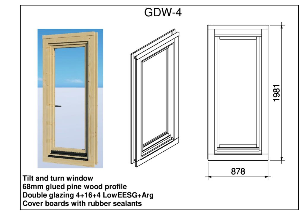 The GDW-4 is a premium wooden window designed for durability and thermal efficiency. Constructed from a robust 68mm glued pine wood profile, this full-height window unit (878mm x 1981mm) combines traditional timber aesthetics with modern functionality.