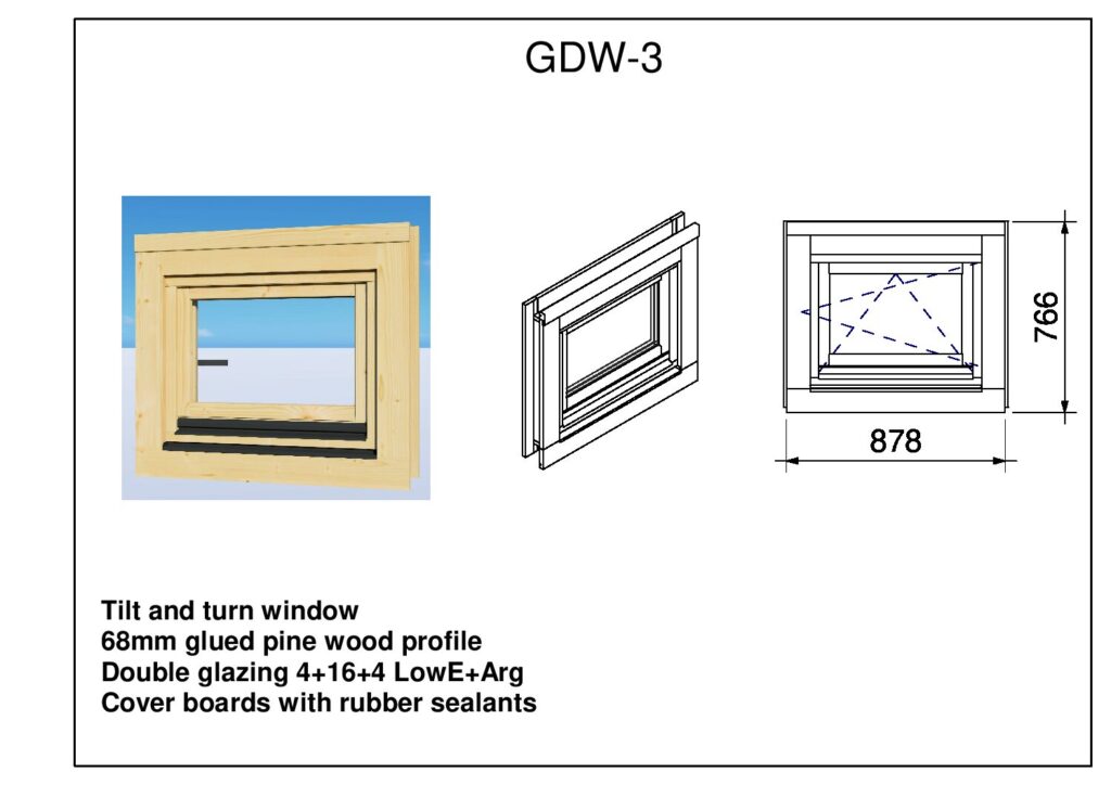 The GDW-3 is a premium wooden window unit designed for durability and thermal efficiency in modern timber construction. Manufactured from 68mm glued pine wood profiles, this unit ensures structural stability and resistance to warping, making it an ideal choice for residential and garden building applications.
