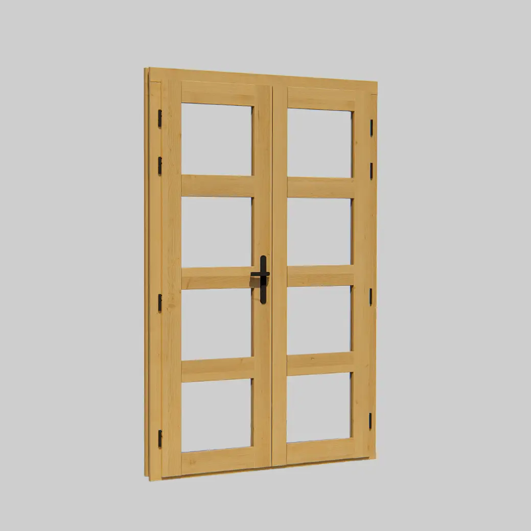 This double-door unit opens outward to maximize interior floor space. It includes a complete hardware set with adjustable hinges and a secure locking mechanism. The glazing panels allow natural light to flood the interior while maintaining weather resistance through integrated rubber sealing.
