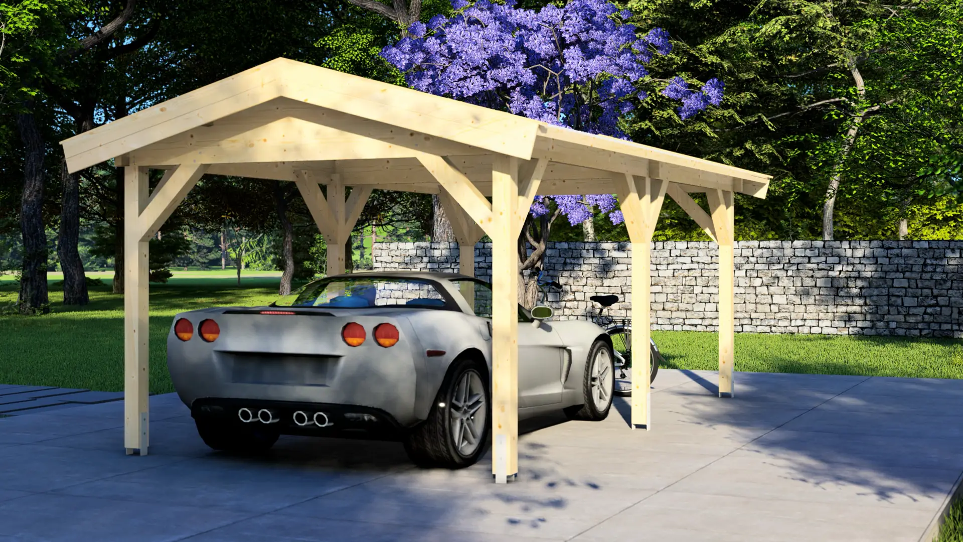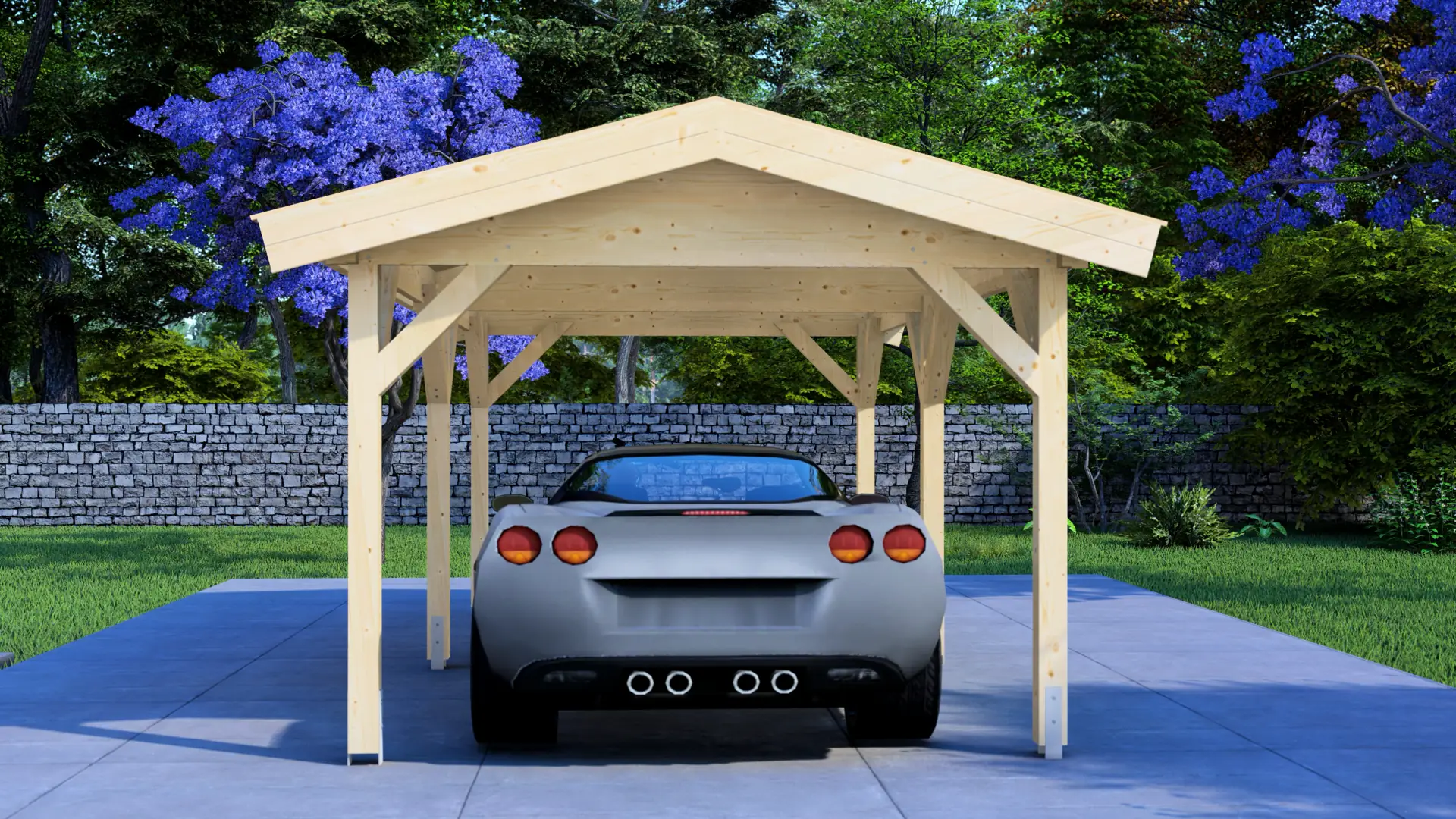 The entire carport is made from Nordic spruce wood with 44mm thick profiles. This wood type is valued for its tight grain pattern, stability, and natural ability to resist moisture. All components are cut to exact measurements using computerised machinery, which means every piece fits together perfectly without any guesswork during assembly.