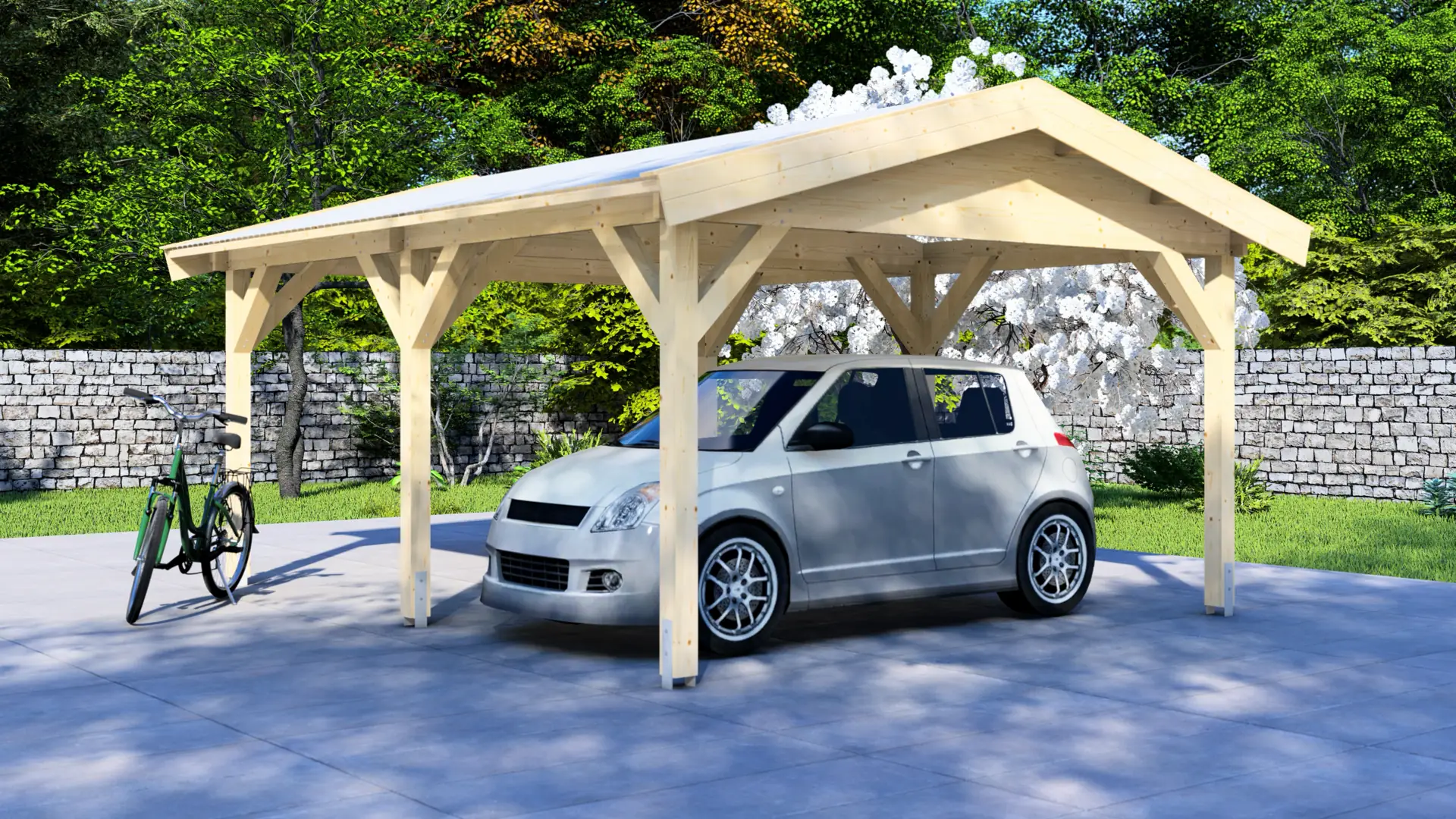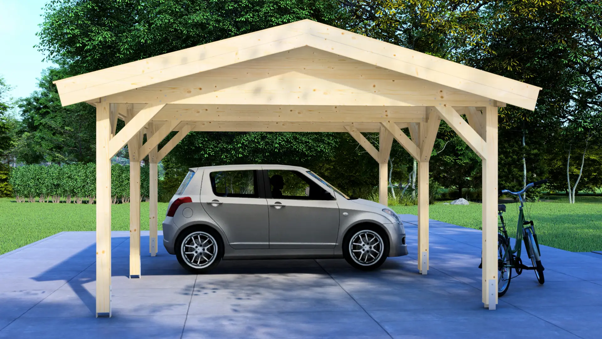 Measuring 5.18 metres long and 4.18 meters wide, this carport stands on six robust posts (120mm square), offering ample space for one standard car or several motorcycles and bicycles. The solid timber framework ensures long-lasting stability. Wooden brackets at each post provide additional strength and visual appeal.
