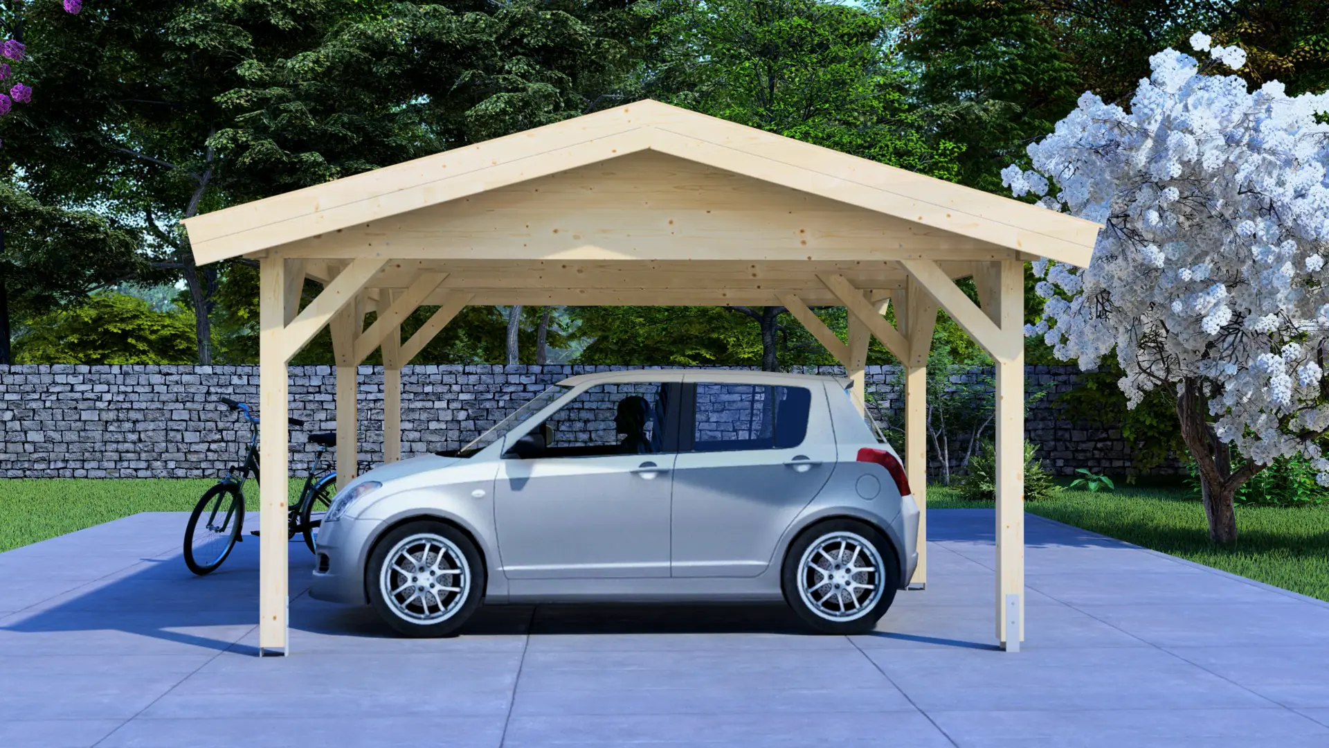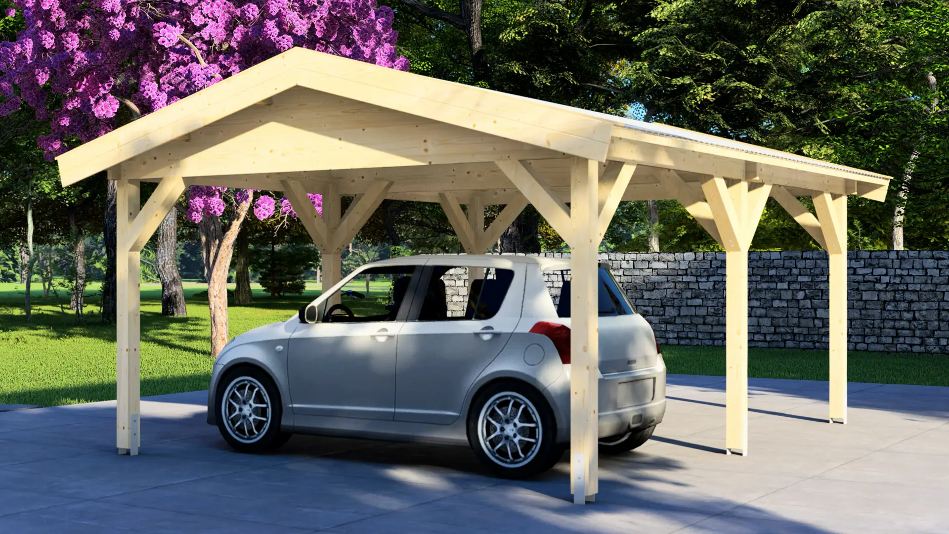 The Carport Classic 7×4 Flat offers substantial shelter for vehicles, equipment, and outdoor spaces. Constructed from premium Nordic spruce, it provides natural weather resistance and durability. This flexible structure serves as vehicle protection, covered workspace, outdoor seating area, storage solution, or entertainment space.